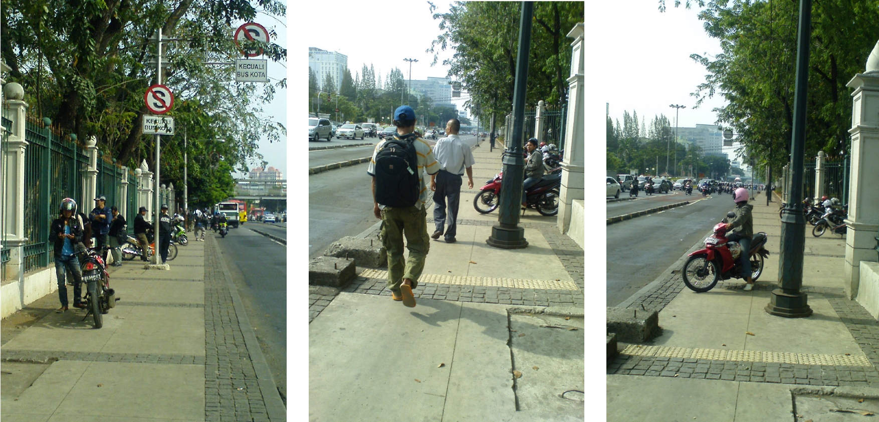 Begitulah kondisi di banyak jalur pejalan kaki di Jakarta. Contoh di atas adalah di depan Stasiun Gambir Jakarta Pusat, salah satu titik silang ganti antar moda transportasi di Jakarta. Selain taksi dan bis, ojek motor adalah salah satu moda transportasi yang dominan di tempat ini.