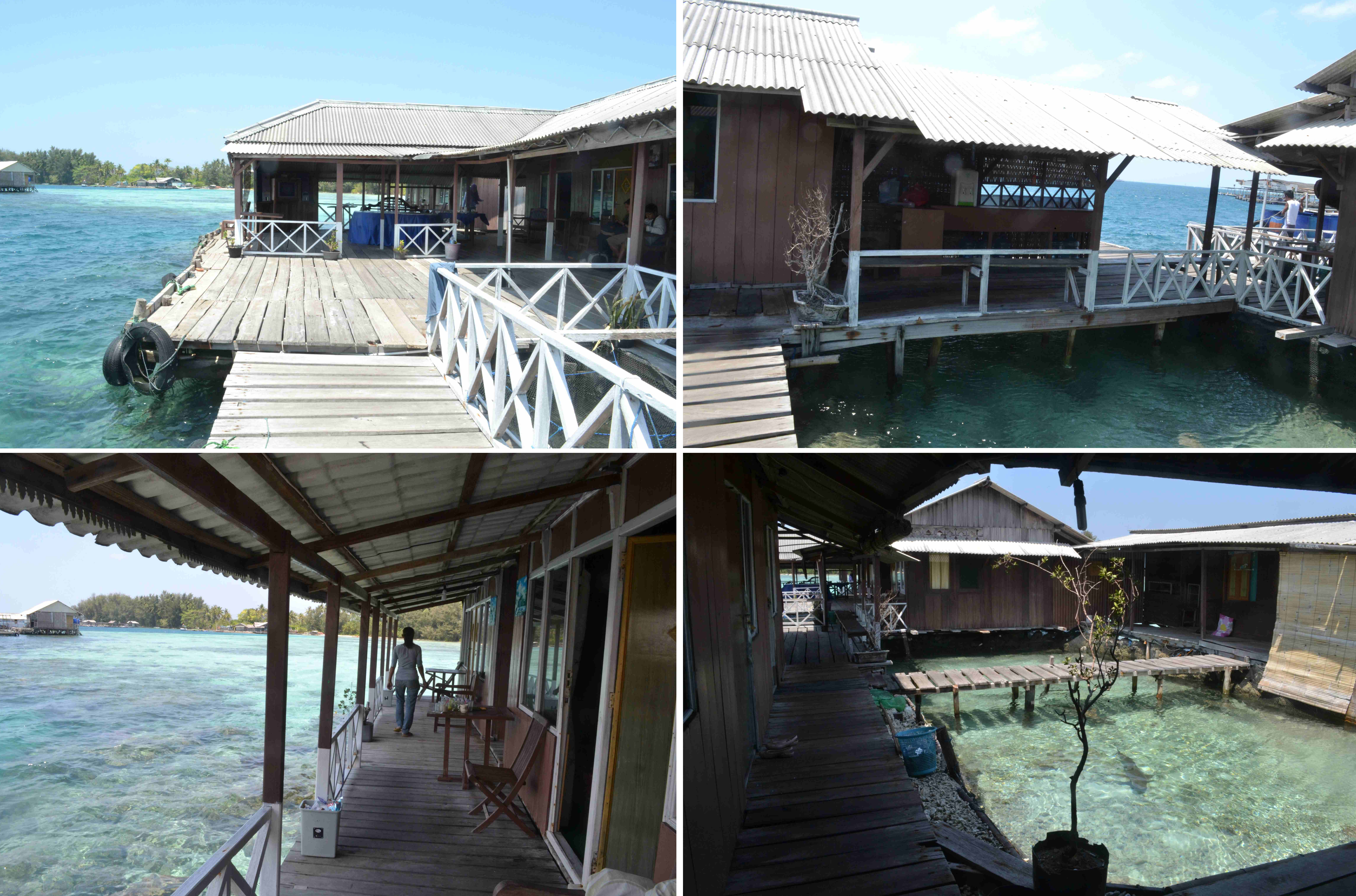 Kayu yang digunakan di bangunan ini adalah kayu yang tahan cuaca seperti damar laut. Jenis kayu ini juga banyak digunakan di dermaga-dermaga tradisional untuk lalu lintas kapal. Baik lantai, dinding maupun handrail teras menggunakan kayu sejenis ini. Pada lantai dan dinding papan-papan kayu ini disusun memanjang. Tentu tidak bisa rapat sekali seperti pasangan kayu parket di rumah tinggal biasa, karena ada sedikit celah-celah di antaranya, sehingga harus berhati-hati apabila ada barang kecil jatuh di lantai, bisa-bisa langsung masuk laut. Untunglah di kamar dipasang karpet sehingga tidak terlalu khawatir akan barang jatuh, ataupun udara yang menyelisip di antara sela-sela papan.