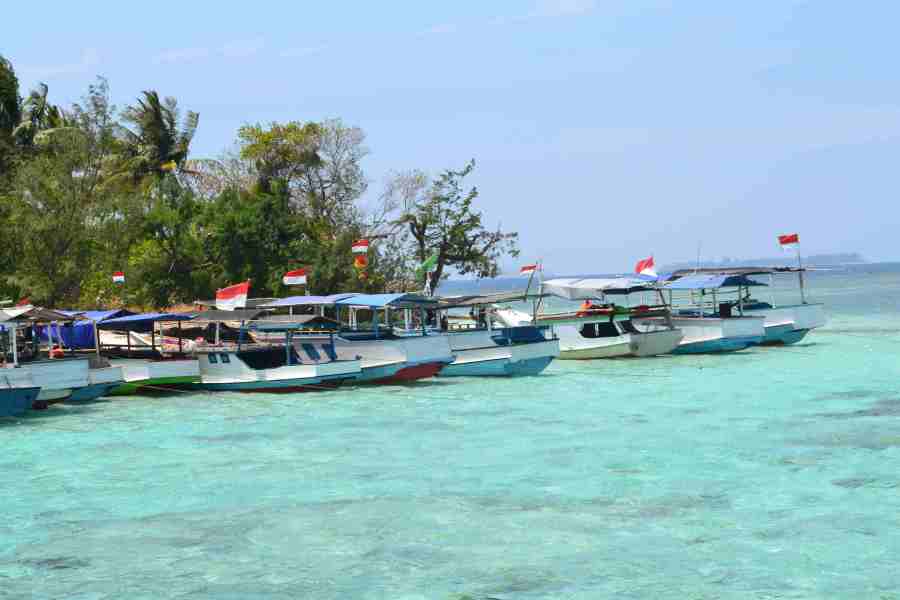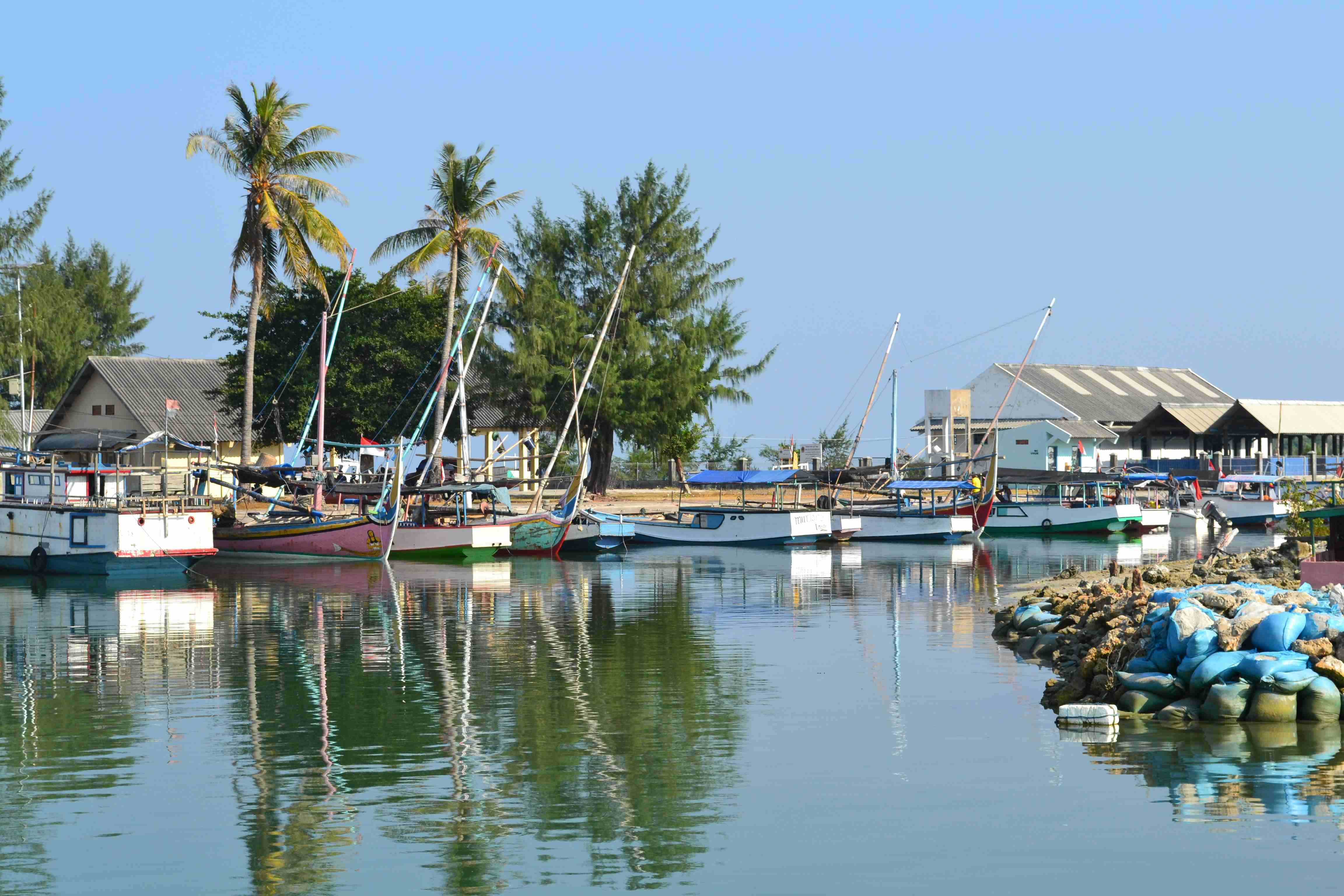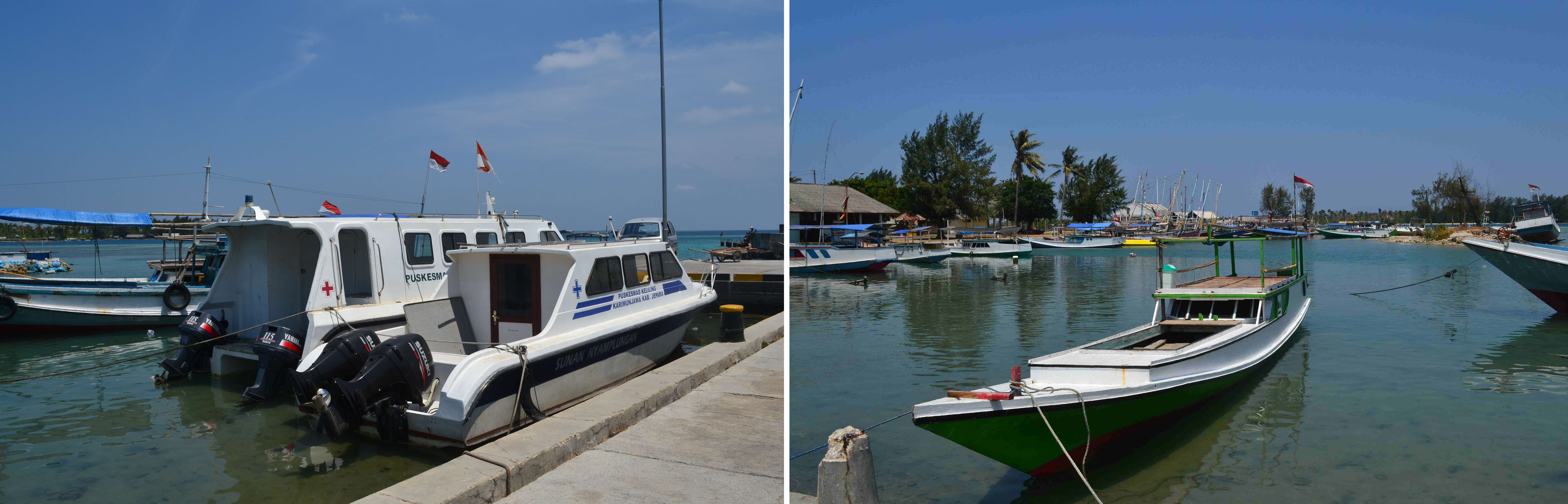 Menjorok ke tengah laut, ada dermaga panjang yang beberapa dijadikan tempat sandar kapal. Dermaga selalu indah dijadikan latar pemotretan. Tempat lalu lalang orang-orang dari laut ke darat, tempat melompat langsung ke laut, atau juga tempat bercengkrama sepasang kekasih. Dari dermaga yang menjorok ke laut ini bisa dilihat juga gradasi air laut yang menunjukkan beda kedalamannya. Semakin gelap warna air lautnya, semakin dalam dasar lautnya. Dari dermaga, kami bisa melihat kapal-kapal bersandar di pantai. Semua kapal-kapal ini berbendera Indonesia! Jadi walaupun sudah jelas bahwa kapal ini hanya beroperasi di perairan Indonesia, namun tetap harus memasang bendera Indonesia pada ujungnya. Melihat deretan bendera itu, bangga rasanya, berharap Indonesia akan lebih memperkuat lautnya dimulai dengan kapal-kapal ini. Karimun Jawa hanyalah miniatur dari Indonesia, yang transportasi utamanya adalah melalui laut, sehingga layak adanya Indonesia belajar dari kepulauan-kepulauan kecil seperti ini untuk memperhitungkan betapa berharganya laut yang kita miliki ini, yang tidak cuma bisa mengambil hasilnya saja, namun juga melindunginya dengan transportasi yang memadai.