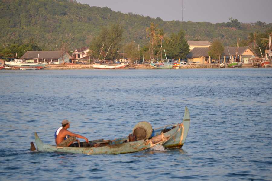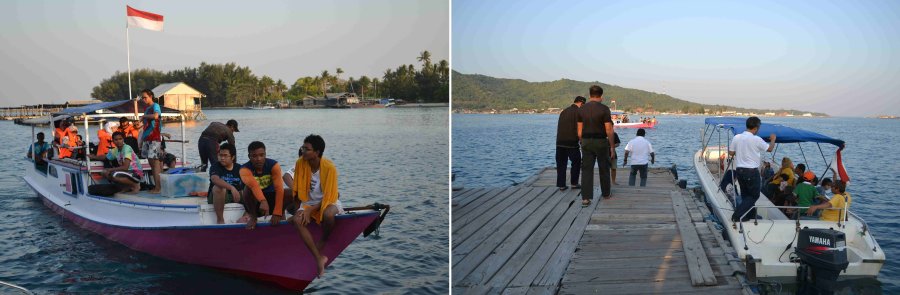 Tak berapa lama memang datang makanan itu bersama rombongan lain yang menginap di tempat yang sama dengan kami. Tentu saja dengan kapal bermotor juga. Dan memang kusadari, bahwa transportasi utama di sini adalah kapal-kapal yang mengantarkan penumpang dari satu pulau ke pulau lain. Tak heran, pemandangan utama di setiap titik adalah kapal. Ada kapal nelayan, kapal penumpang, perahu kecil, motor boat yang mahal, sampai pernah di satu titik kami berpapasan dengan kapal tongkang. Bahkan ada puskesmas keliling berupa kapal yang kala itu bersandar di pelabuhan.