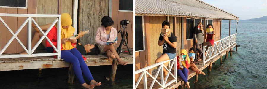 Di Kepulauan Karimun Jawa, kami tinggal di Wisma Apung, sebuah penginapan di tengah laut yang berjarak sekitar 7 menit naik kapal bermotor dari dermaga barat, yang dibangun dari kayu-kayu dengan ketinggian sekitar 50-60 cm di atas muka air lautnya di sore hari. Jika duduk-duduk di depan kamar menghadap teras, bisa langsung memandang laut yang berlatar pulau Karimunjawa besar. Kadang terdengar debur ombak menampar-nampar terasa sedikit menderakkan bangunan itu. Dengan kaki menjulur ke laut sambil melamun serasa berada di kapal yang sedang menjangkar.