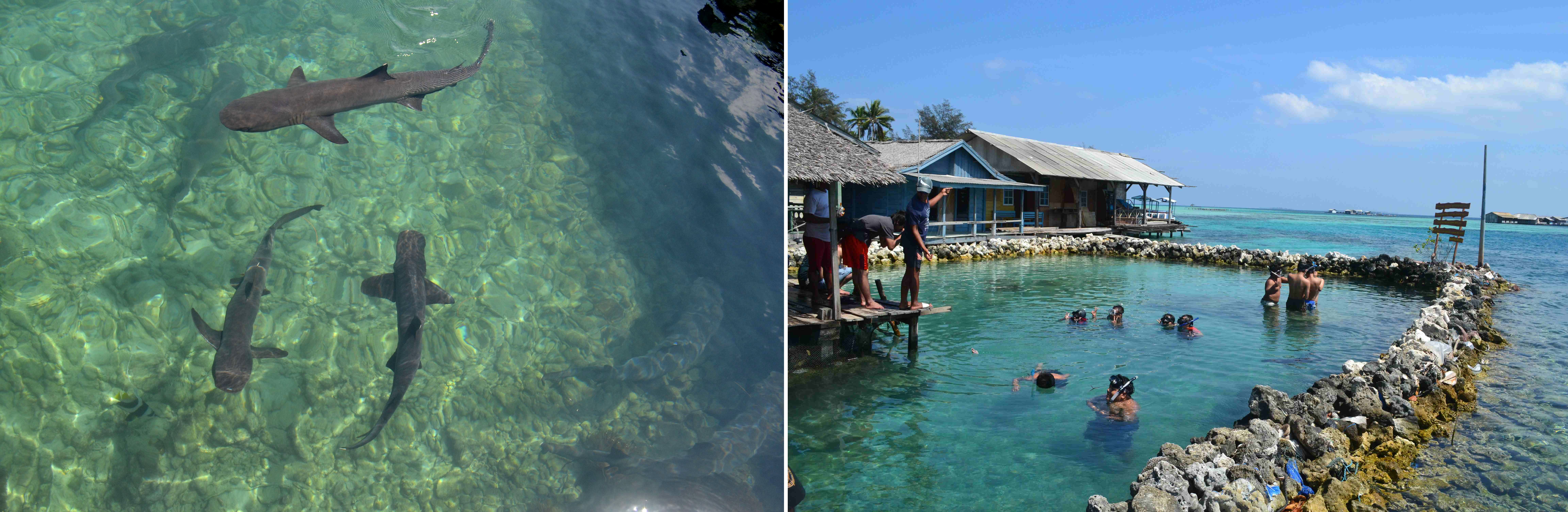 Beberapa aktivitas lain yang bisa dilakukan di sini adalah melihat penangkaran hiu hitam dan hiu putih. Dengan usianya yang masih muda, banyak yang mengambil kesempatan untuk berenang dengan hiu. Namun aku gamang berada di dekat hewan yang cepat membaui darah ini. Hanya sebentar berada di air bersama mereka, aku gentar dan memilih untuk memotret-motret dari atas. Selain itu, sebenarnya kita bisa mengamati pembiakan ikan kerapu di beberapa titik di sekitar Wisma Apung. Bangunan di tengah laut dengan keramba-keramba di sekitarnya mendominasi pemandangan sekitar.