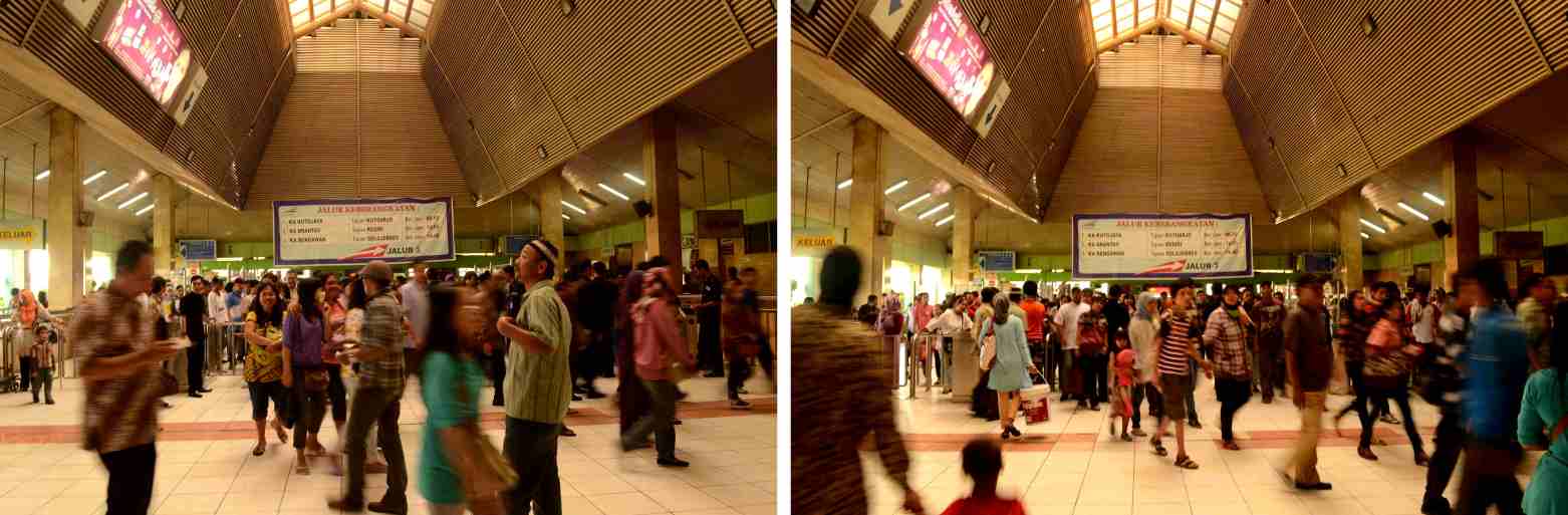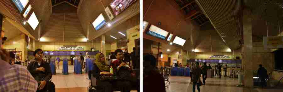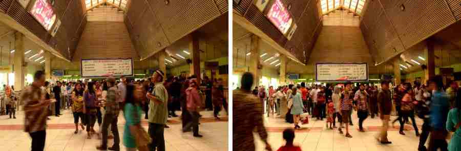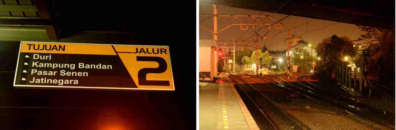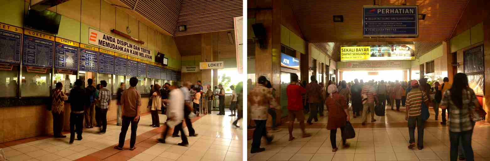 keluar lobby, melalui deretan petugas, di luar, satu loket dipadati pencari tiket.lobby luar utama, di depan area loket, sebelum pemeriksaan karcis. ribuan orang keluar dari pintu ini setiap hari.di depan loket, orang melihat-lihat tarif, melihat-lihat jadwal, menunggu handai taulan yang datang dari luar kota.di ruang tunggu, orang menanti kereta. pengumuman didengungkan setiap beberapa menit. turun ke jalur mana?jika kereta terlambat, orang menyesaki peron, tak sabar menunggu kapan keretanya akan tiba. tak sesuai jadwal.jam 21.00 malam hari. kereta luar kota sudah berangkat, tinggal rel sepi dan penumpang menunggu commuter line.kereta tiba malam hari, namun tak banyak yang menanti. gerbong pertama dan terakhir khusus wanita. pria, jangan salah naik.kau mau ke mana? tentukan tujuanmu. jangan salah ke dipo bengkel kereta api di ujung sana. itu hanya untuk petugas.