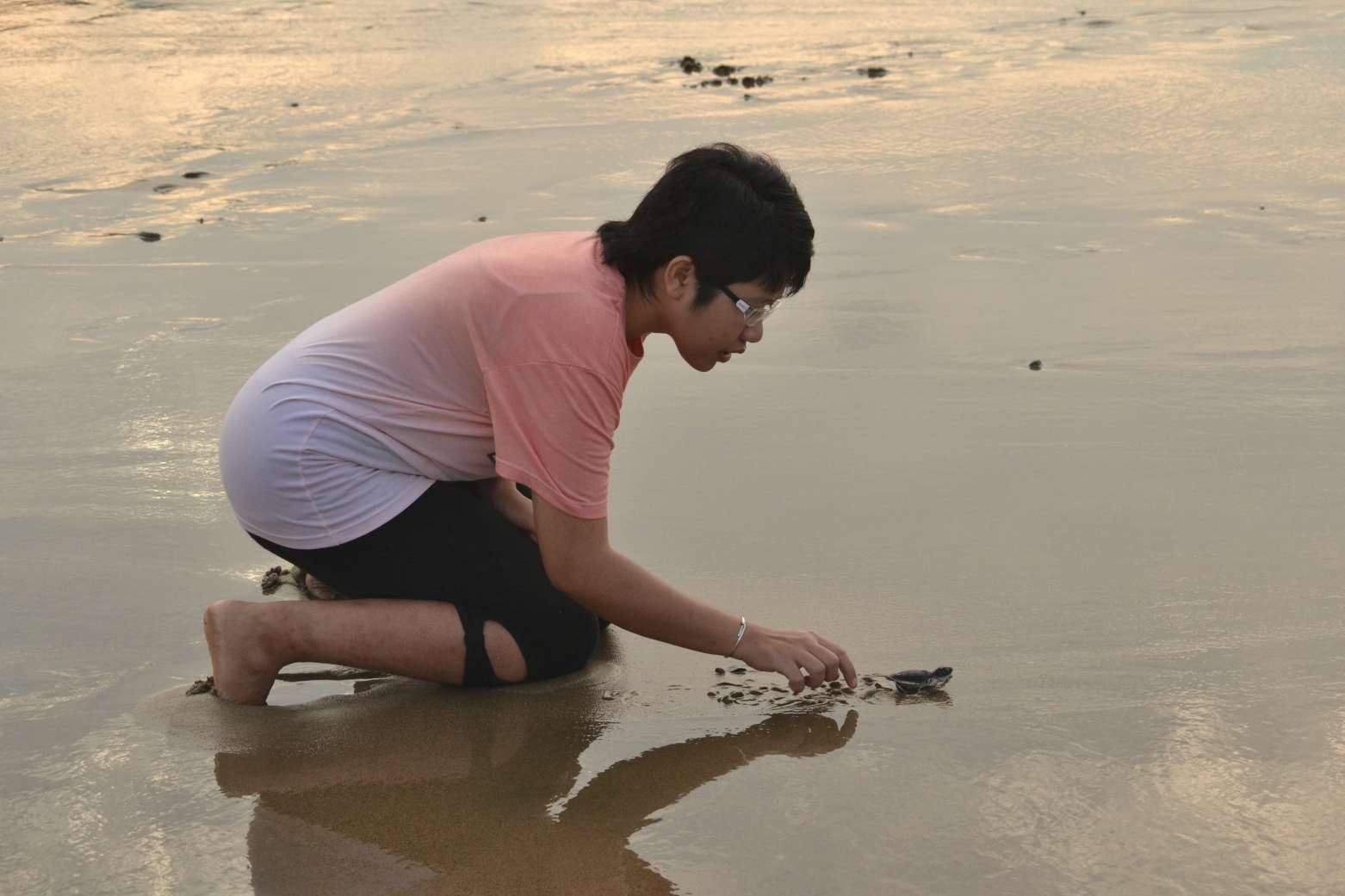Sebenarnya bisa saja tukik itu kami lepas beramai-ramai, namun supaya lebih epik, maka kami melepasnya satu per satu. Giliran pertama yang melepas adalah Sansan. Dinasihatinya satu-satu dua tukik yang akan ia lepas yang dinamai Prita dan Dewi itu. Persis seperti seorang ayah yang akan melepas putrinya pergi sekolah ke tempat yang jauh. Pertama diturunkan ke laut, Prita dan Dewi sempat terhempas ombak lagi ke daratan namun mereka cepat menggerakkan tangannya untuk beradaptasi berenang. Tak lama ikut menyurut ke laut, kedua tukik itu juga sempat kembali ketika ombak kecil datang. Namun di hempasan berikutnya, tukik-tukik itu sudah menghilang bersama air laut yang membawa mereka ke alam bebas. Selamat jalan tukik! Semoga kelak engkau kembali sebagai untuk bertelur di sini, ya!