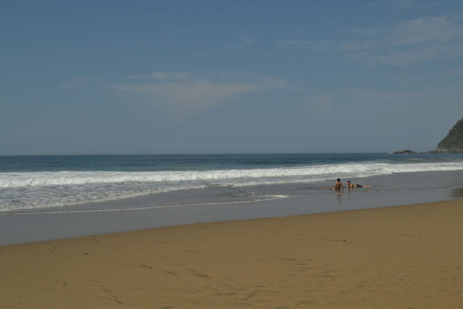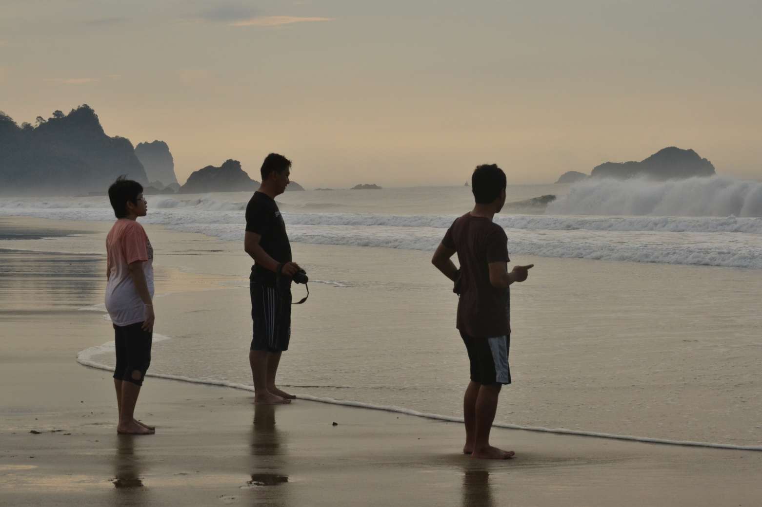 Ketika berjalan menuju pantai, kami baru menyadari bahwa jalanan yang kami kira setapak semalam ternyata cukup lebar, hampir dua meter. Kiri kanannya hutan yang cukup rapat. Tak lama kami tiba di tepi pantai dan sudah banyak rombongan dan anak-anak yang ramai-ramai melepas tukik juga. Kami agak memisahkan diri dari rombongan, lalu mulai berfoto-foto.