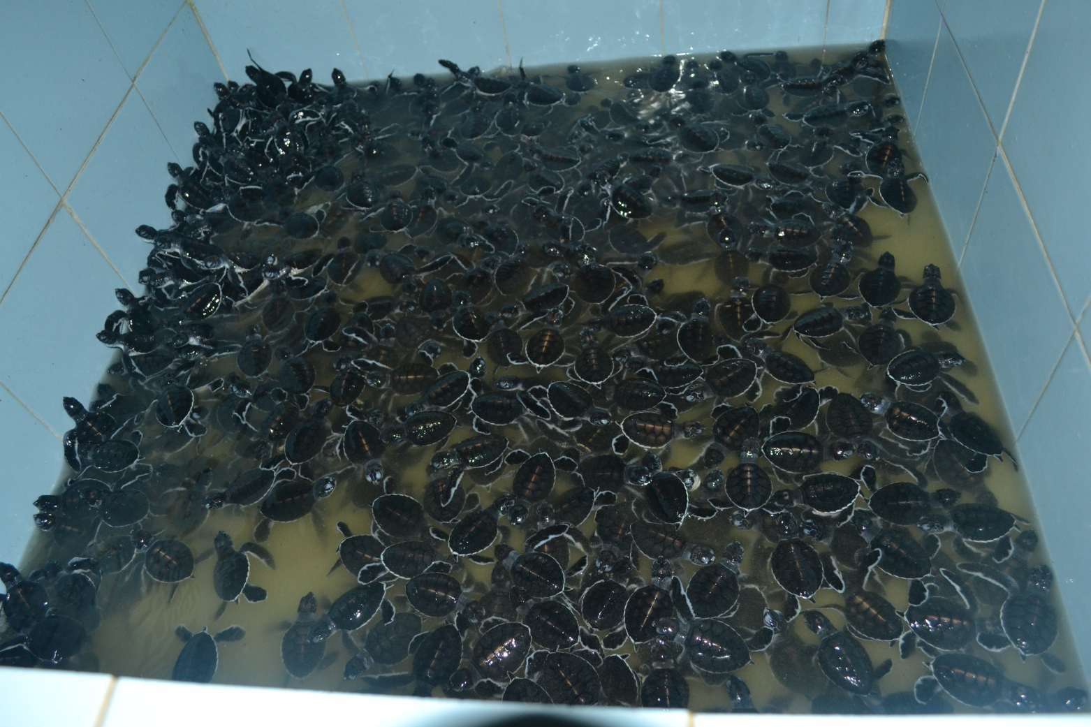 Kemudian kami berpindah ke bangunan sebelah. Terdapat bak-bak berisi tukik dengan usia yang bermacam-macam. Tukik dijadikan satu dalam satu periode penetasan. Bak terakhir yang kami lihat adalah tukik-tukik yang siap dilepas ke lautan. Aku mencoba mengangkat tukik-tukik mungil itu, terasa lunak di bagian dadanya, namun cangkang punggungnya sudah mulai mengeras.