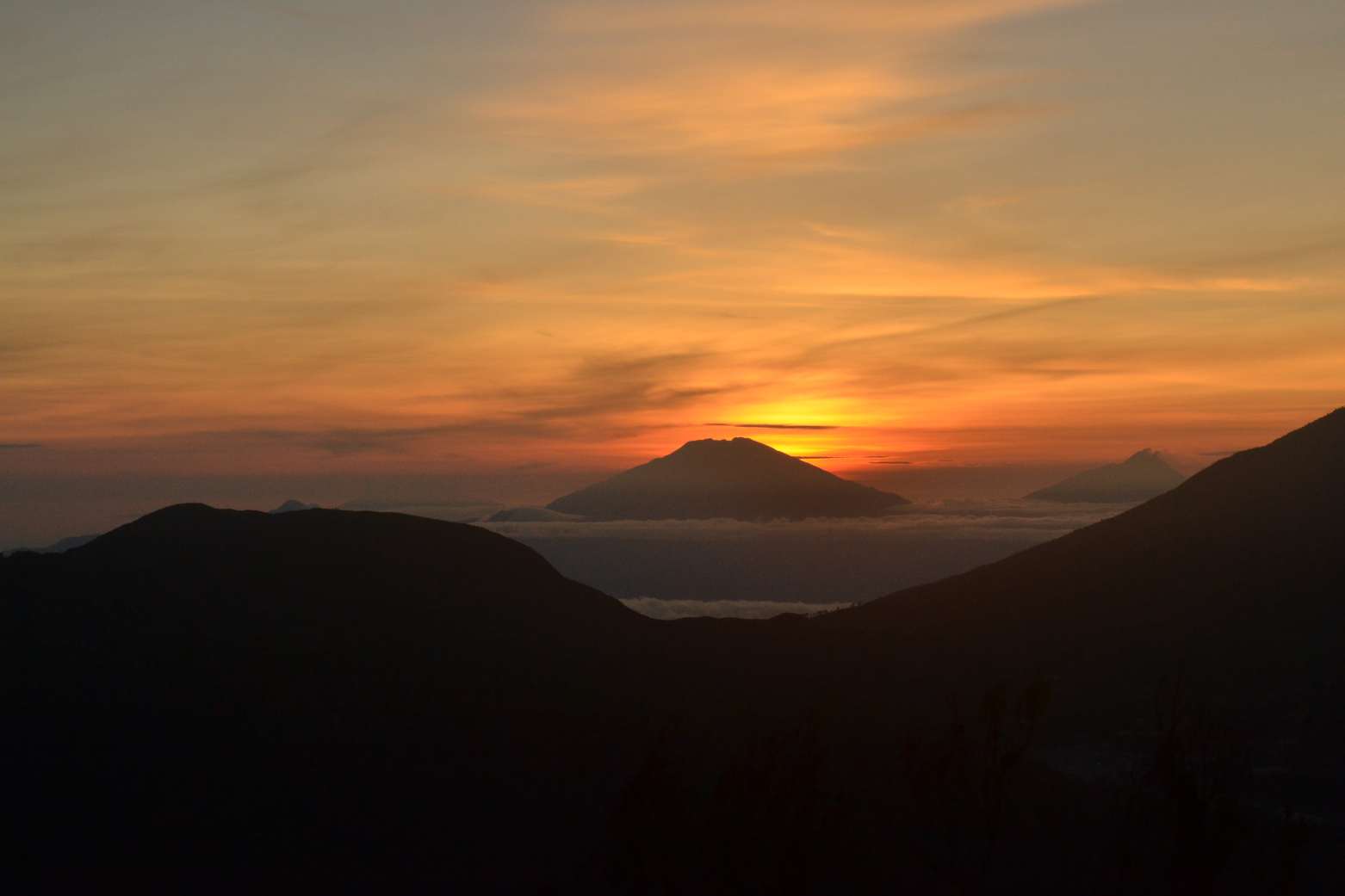 Namun apa yang ada di alam memang lebih indah dilihat dengan mata kepala sendiri. Usai memotret sebentar, aku memilih untuk menikmati bagaimana bola jingga itu beranjak dari bias cahaya yang mengemaskan awan yang bertaburan di bawah pegunungan, hingga ia lepas ke angkasa. Gumpalan awan tebal masih menghampar di bawah memanggil-manggil untuk dilompati seperti kasur empuk yang ditinggalkan melawan kantuk pagi itu.