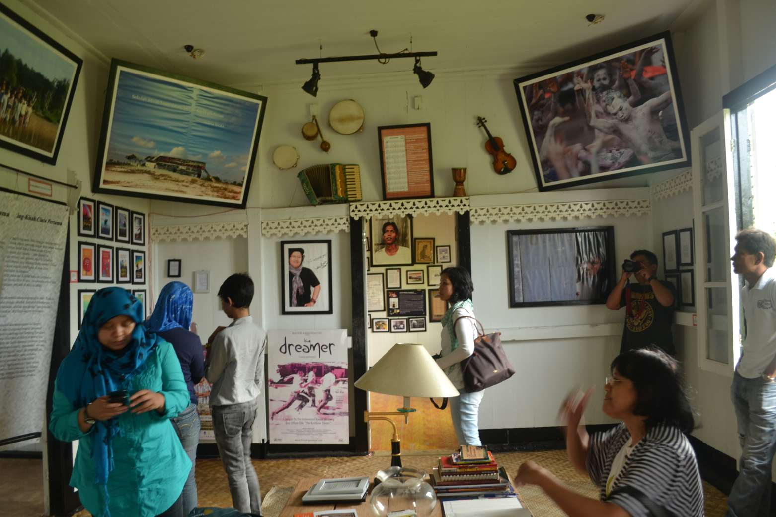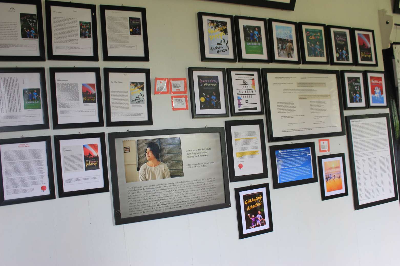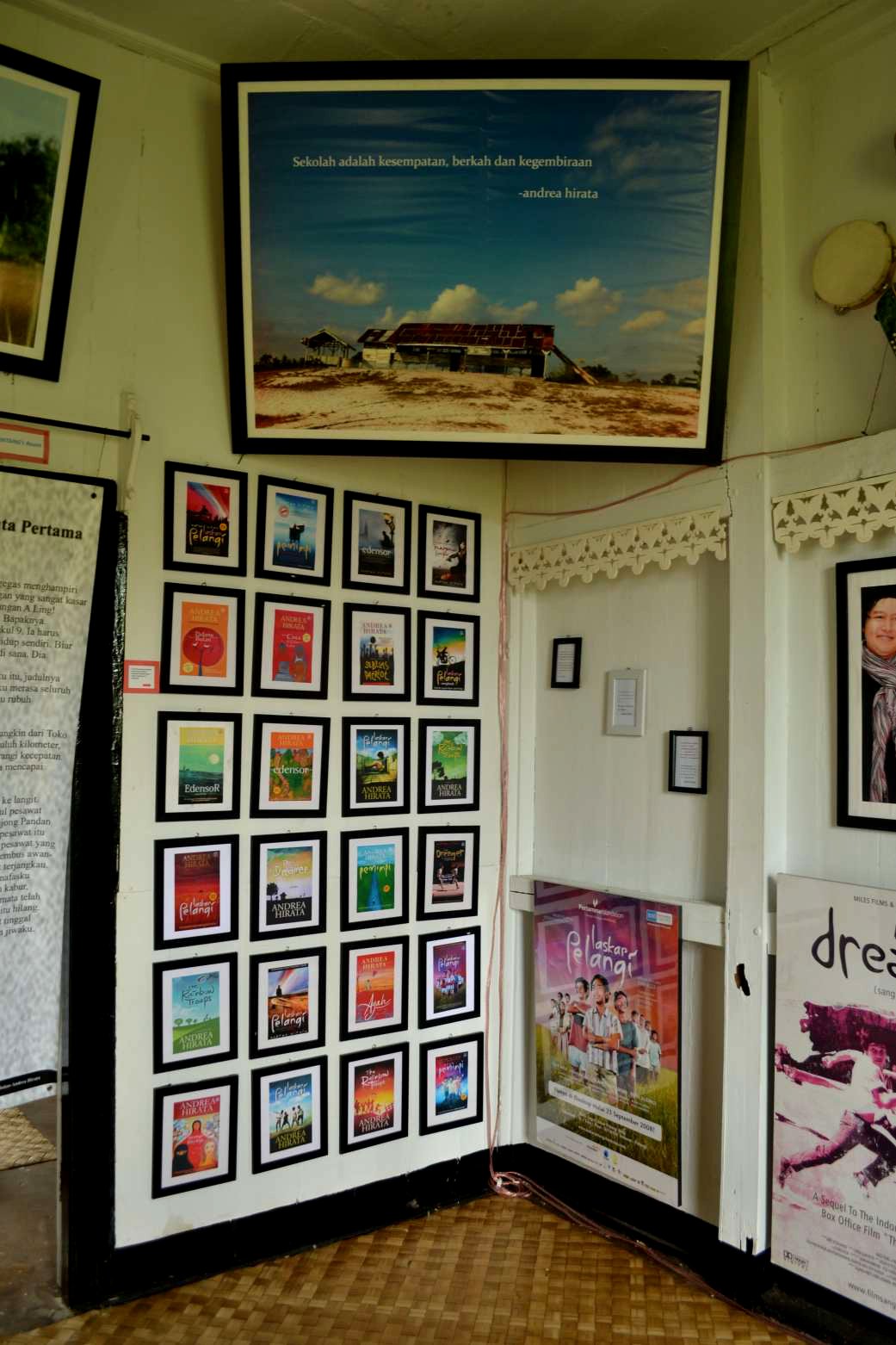 Ruangan depan terdapat berbagai poster, kemudian masuk ke ruangan dalam yang luas seperti ruang keluarga. Di tengahnya terdapat meja besar dengan dua bangku panjang di sampingnya. Dindingnya dihiasi poster gambar sampul Laskar Pelangi dalam berbagai bahasa. Ada dua kamar di samping kiri. Di ruangan-ruangan kamar yang belum jelas fungsinya itu juga tertempel poster-poster dari film Laskar Pelangi.