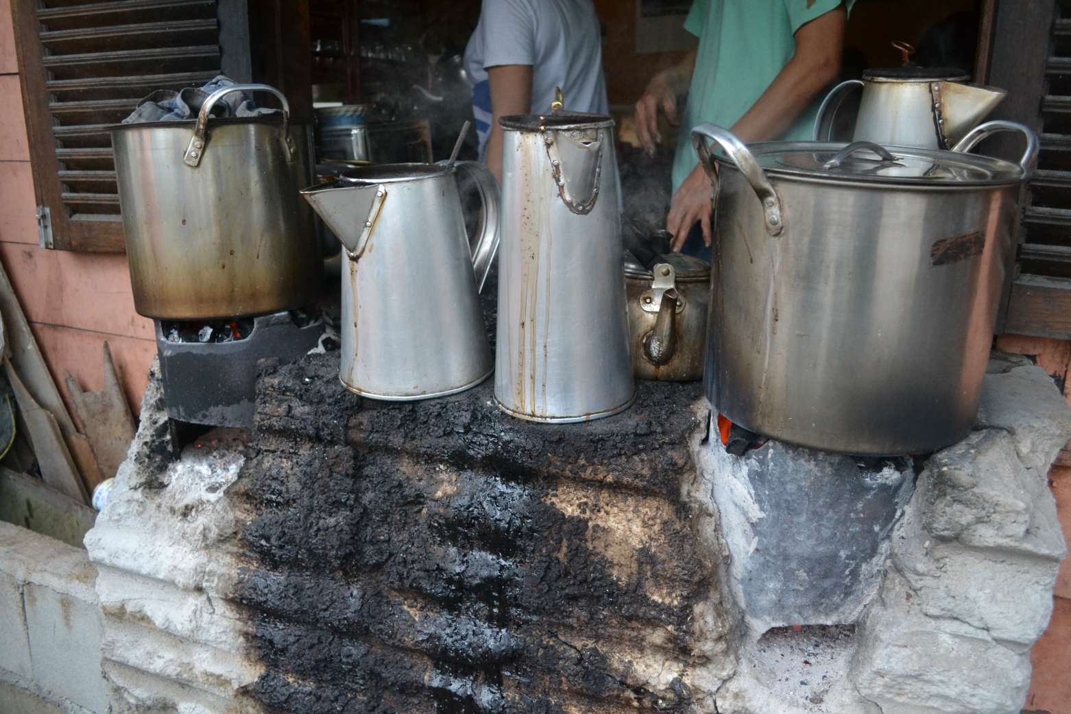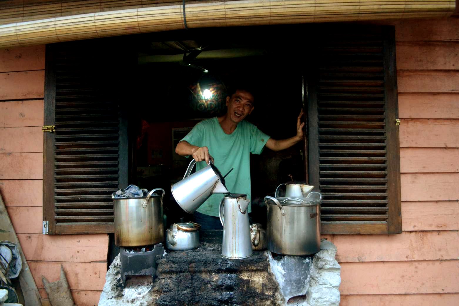 Kopinya sendiri dijerang dalam tungku batu di ceret-ceret stainless steel di samping warung, yang menghadap ke jalan raya. Kemudahan posisi dapur ini membuat si engkoh penjual mudah untuk melayani apabila ada pelanggan yang ‘take-away’, langsung berteriak lewat jendela, kopi dibungkus dalam wadah plastik, lalu langsung dibawa. Segelas kopi harganya hanya Rp 5000,-. Tak lama kami datang, pelanggan-pelanggan pun mulai banyak berdatangan ke tempat ini. Ada yang sendiri lalu nongkrong saja, ada yang bersama temannya.