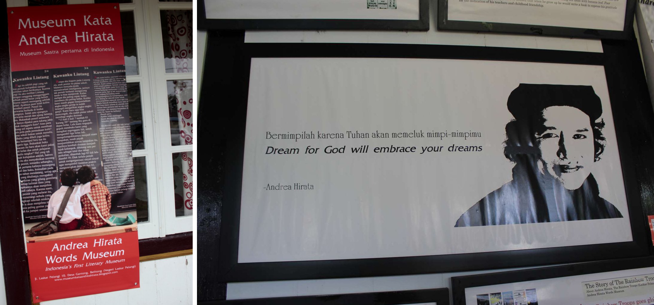 Sesudah siang berjalan-jalan ke bendungan, kami menuju desa tempat tinggal Andrea Hirata. Di sana, ia mendirikan Museum Kata Andrea Hirata, yang berisi koleksi poster-poster, kutipan-kutipan menggugah, juga contoh sampul dari berbagai edisi buku karyanya. Museum ini berada dekat dengan rumah orang tua Andrea Hirata. Bentuknya mengikuti bebanyakan rumah asli di sana, dengan kayu-kayu, atap seng. Lantainya masih dari kayu beralaskan tikar. Ada beberapa ruangan di dalamnya seperti rumah tinggal biasa, namun dialihfungsikan sebagai museum.