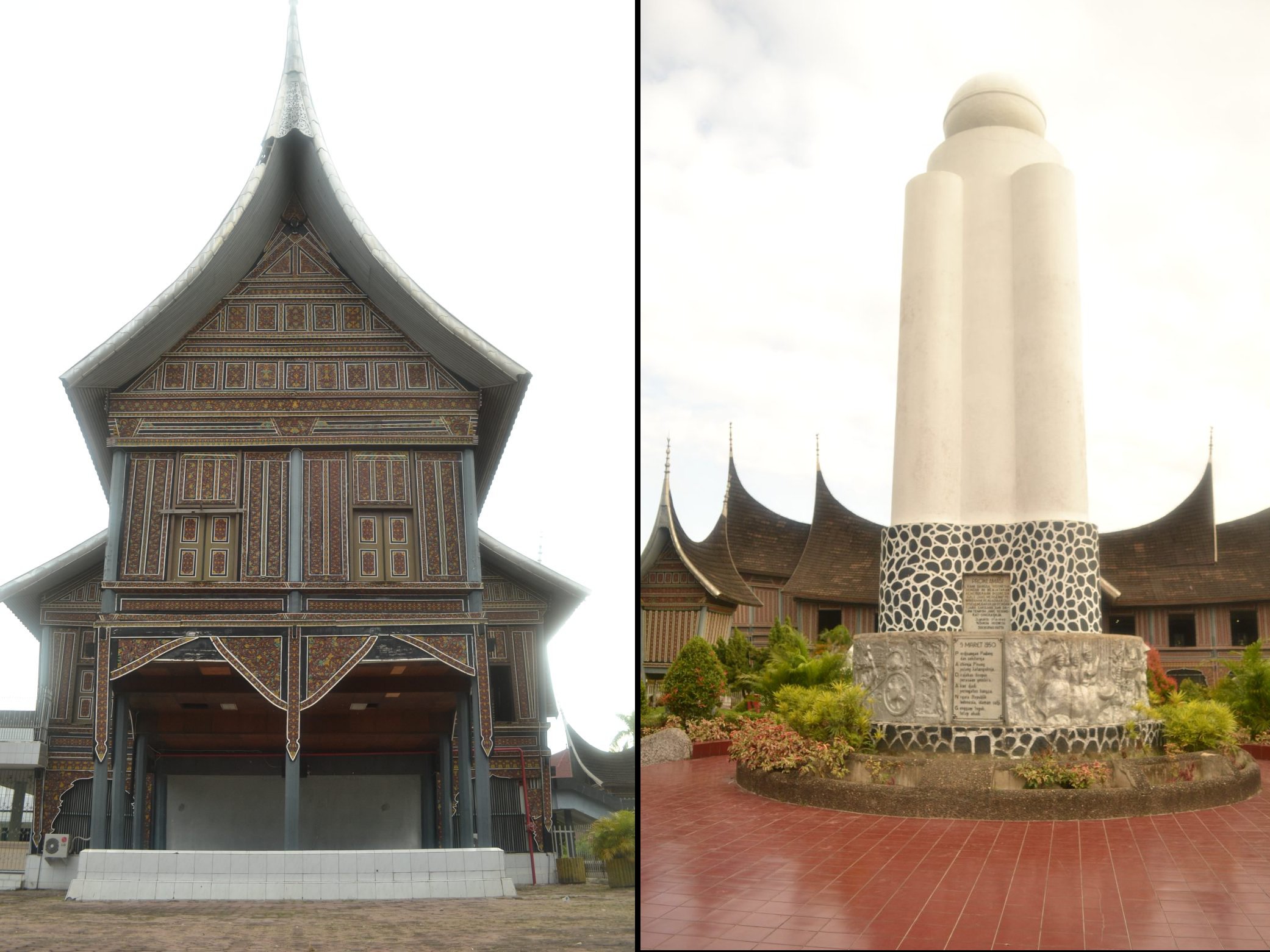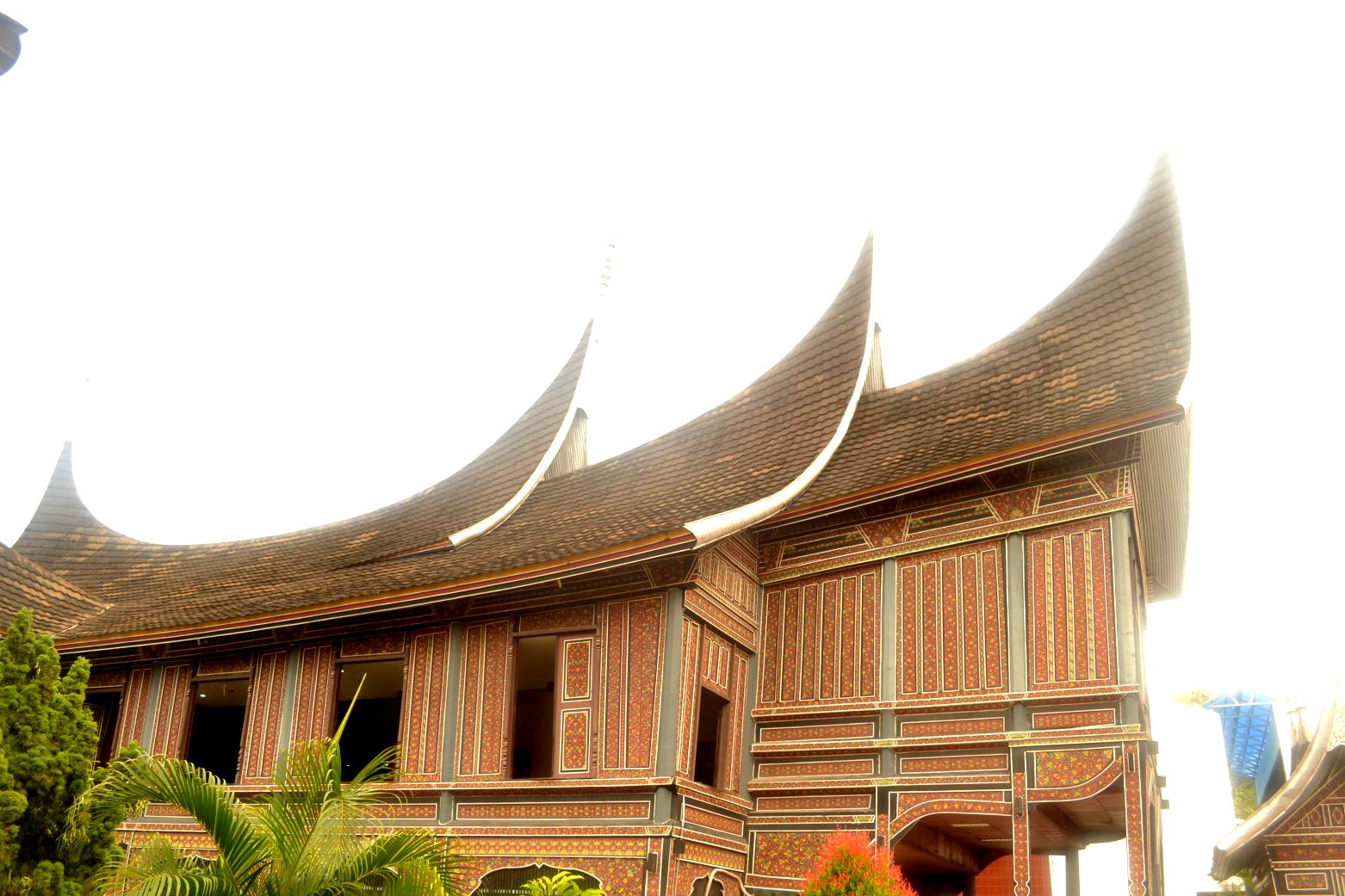 Terdapat tugu tepat di depan museum ini yang membuat aku cukup kesulitan mengambil gambar keseluruhan museum. Di depan museum utama terdapat dua lumbung. Museum ini mengambil bentuk arsitektur khas Minangkabau yaitu rumah gadang (rumah besar) yang berada di atas tiang-tiang kayu dengan jarak yang teratur. Terdapat tangga besar di depan sebagai jalan masuk utama ke museum. Pintu dan jendelanya diukir dengan motif yang kaya, salah satu motif kekayaan nusantara. Bangunan ini memanjang dari barat ke timur dan menghadap ke selatan.