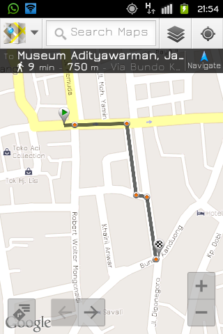 Setelah 20 menit berjalan dan sudah mulai lelah kami mengecek lagi ke google map dan menemukan titik berkedip tanda sudah dekat. Namun dimanakah kami sebenarnya? Ha, ternyata posisi di gadget pun membuat kami meragu. Kami pun menyapa seorang penjual mie goreng untuk menanyakan tikungan yang pas menuju penginapan. Ternyata benar dua tikungan lagi ke kanan sampailah kami di jalan Pemuda dan ditemuilah di persimpangan tempat Hotel Hangtuah berada.