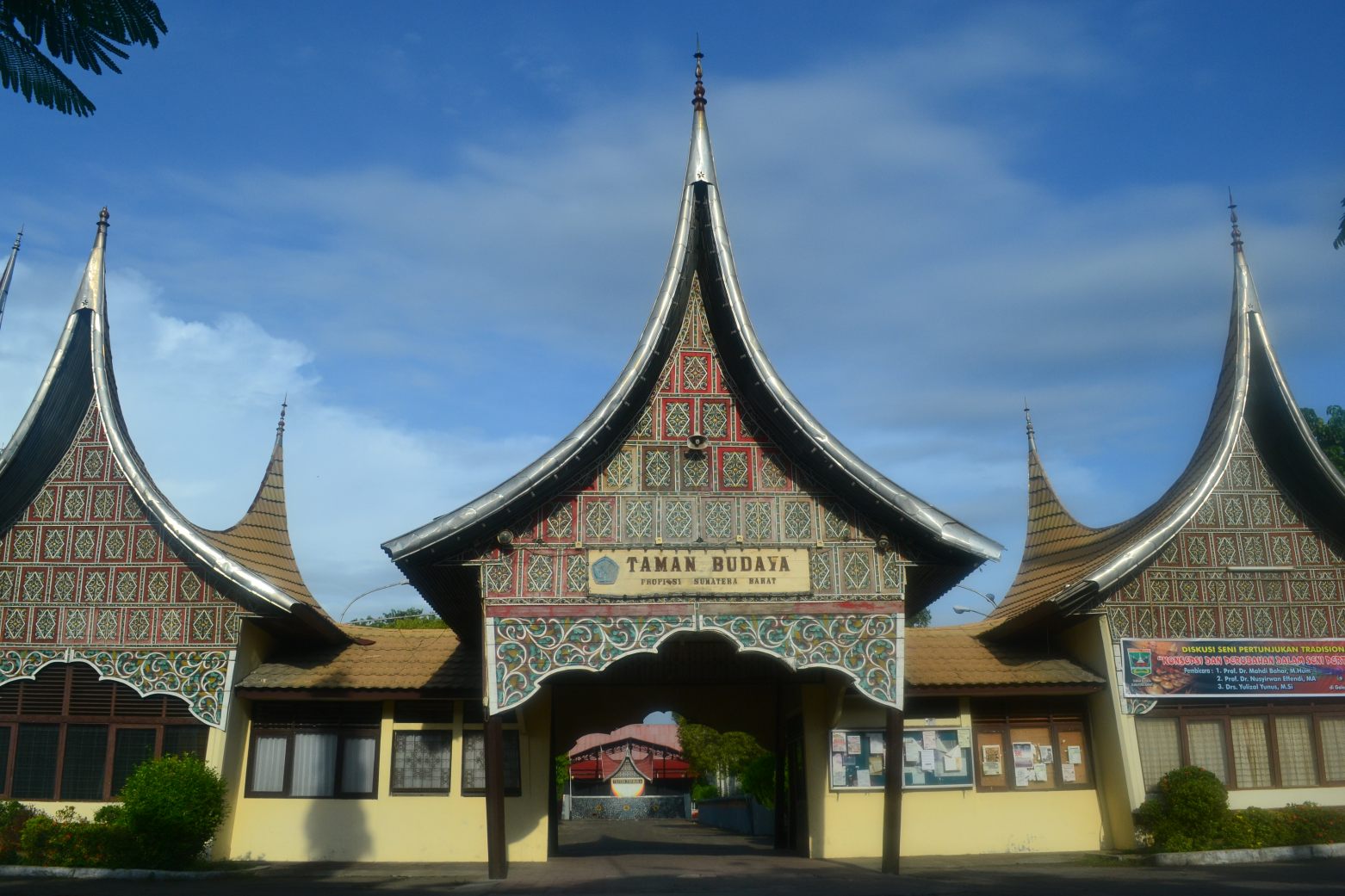Sesudah sarapan gratis di hotel, kami mulai berjalan di trotoar jalan melewati beberapa perkantoran dan Museum Gempa Padang. Dalam 10 menit termasuk ber foto-foto kami sudah sampai di depan Taman Budaya Sumatera Barat. Di bagian depan tampak hiasan gonjongnya yang khas. Mula-mula kami masuk melalui gerbang bukaan yang di kiri-kanannya difungsikan sebagai ruangan kantor. Sesudah masuk, di kiri terdapat bangunan balai pertemuan yang bisa digunakan sebagai area pertunjukan tertutup. Apabila ada acara kebudayaan bisa menggunakan bangunan yang juga beratapkan gonjong itu. Tepat di depan jalan kami ada teater terbuka. Sayang, karena kami datang terlalu pagi sehingga tidak ada kegiatan apa pun di sini.