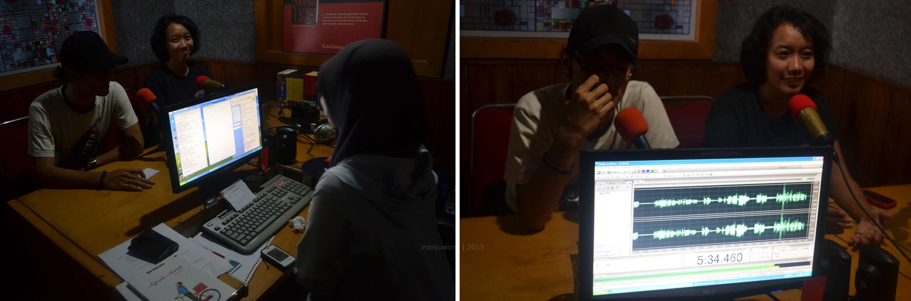 Ruangan mungil ini hanya berukuran 2×2 m berwarna kelabu, berisi satu meja dengan satu layar monitor dan papan ketik. Tiga kursi untuk tamu yang diwawancara berada di depannya. Ada tiga mic dan headphone di meja yang segera dikenakan oleh aku dan Denie. Lantainya beralas karpet dan dindingnya dilapis peredam dari bahan lunak. Peredam ini untuk meminimalisasi gangguan suara dari luar, juga menyerap gaung yang mungkin terjadi apabila suara terkena permukaan keras. Pra ikut masuk untuk memotret kami. Ruangan yang sempit ini membuatnya kurang leluasa mengambil gambar.