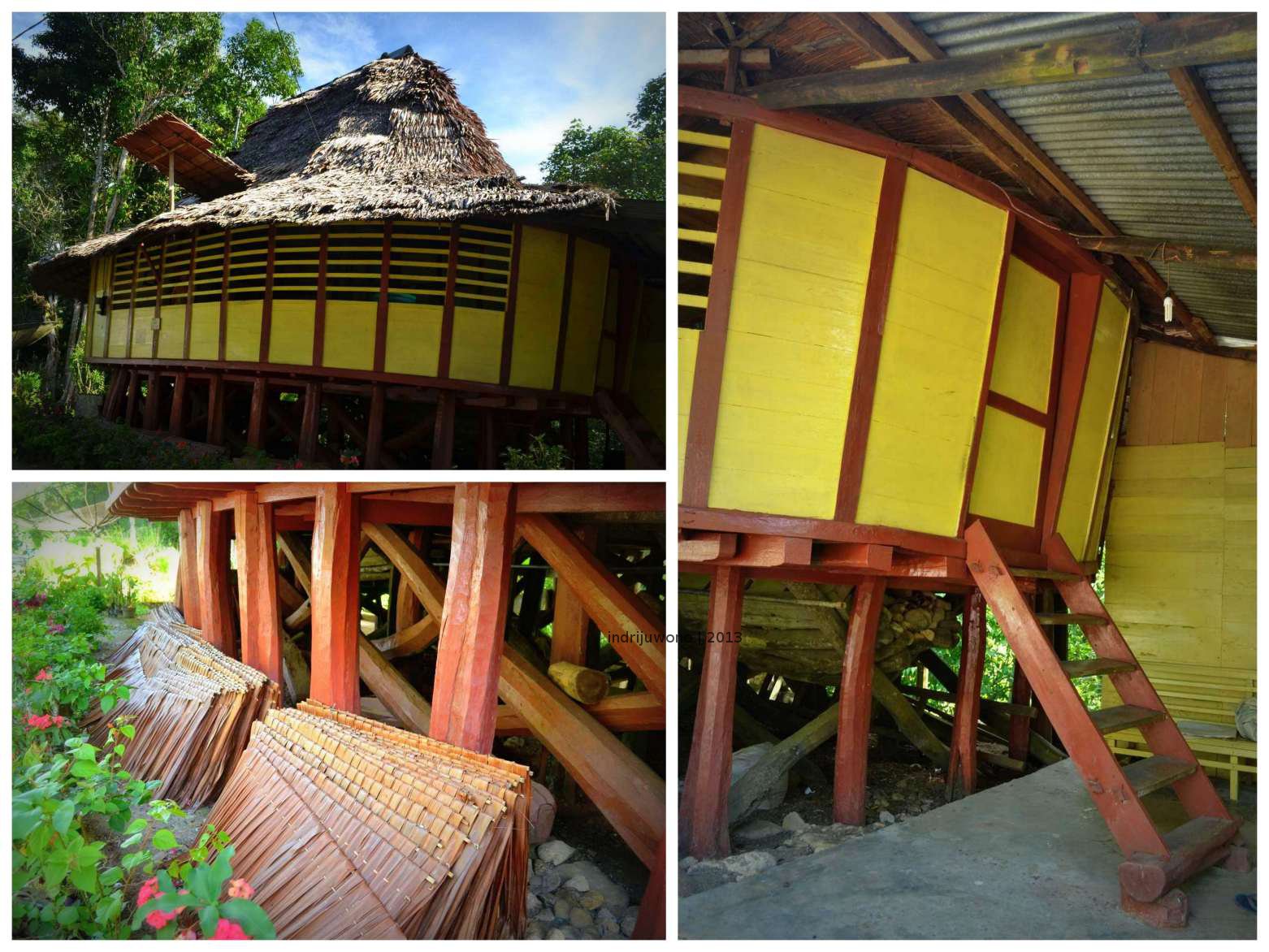 tangga naik langsung, tepian atap, dan tiang-tiang silang penyangga rumah