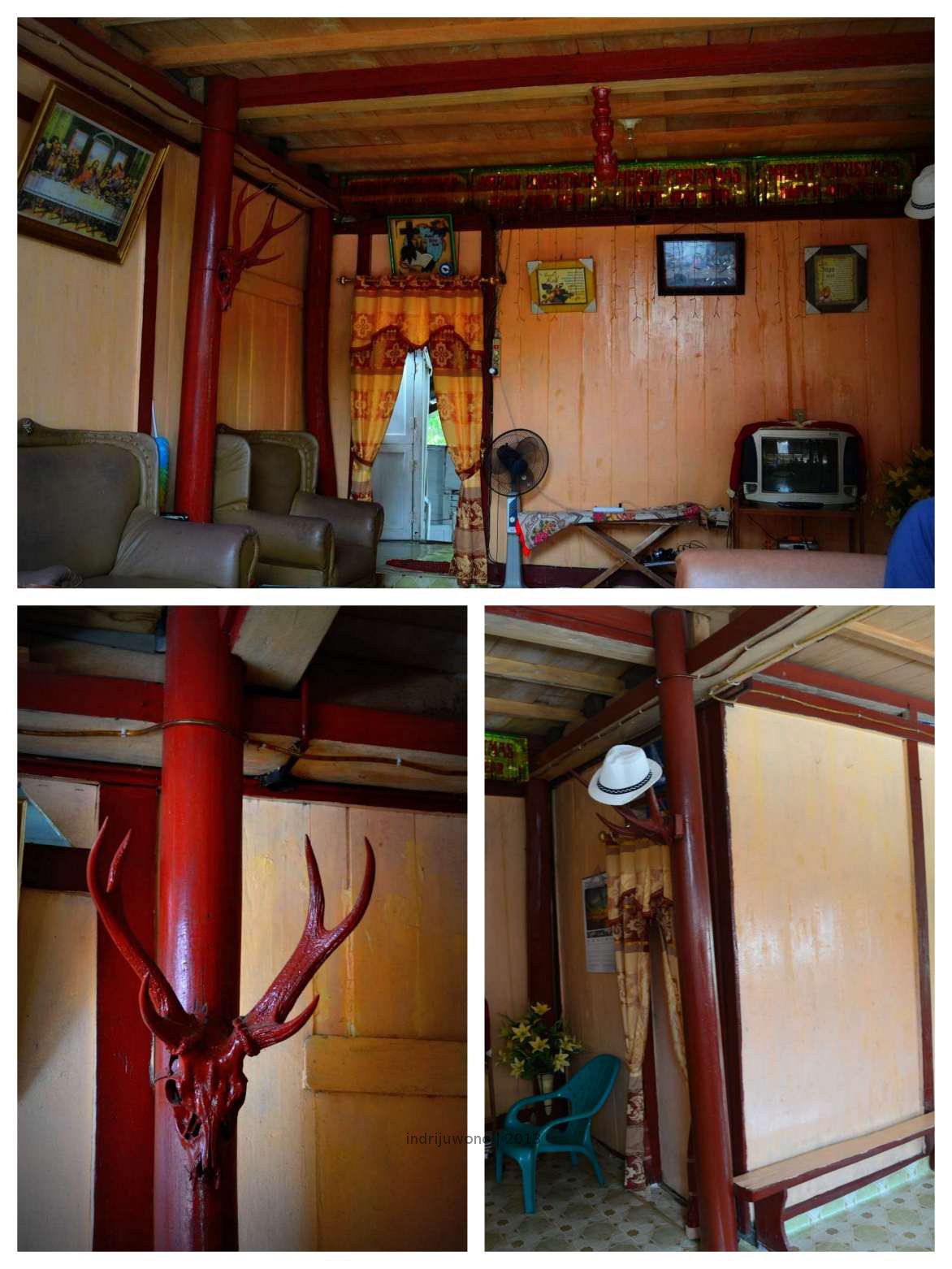 Dinding bangunan menggunakan papan kayu yang disusun berdiri mengelilingi atap rumah. Bagian menghadap jalan di area ruang bersama dilengkapi dengan lubang jendela. Lantai area ruang terdapat perbedaan ketinggian sekitar 10 cm di bagian tengah, untuk memisahkan laki-laki yang mendapat area lebih tinggi dari perempuan di acara bersama. Di tepian, ketinggian lantai naik lagi 10 cm untuk tempat para tetua duduk. Terdapat bangku melingkar mengikuti bentuk oval bangunan tepat di tepian jendela. Tamu-tamu yang bersilaturahmi bisa duduk juga di bangku ini sambil melihat-lihat sekitar melalui jendela. Di luar jendela, terdapat gigi babi yang sengaja digantung. Konon semakin banyak gigi babi yang digantung menunjukkan status sosial yang semakin tinggi. Selain pertanda perburuan, banyaknya babi juga menjadi gengsi dalam acara-acara adat yang pernah diadakan di rumah ini.