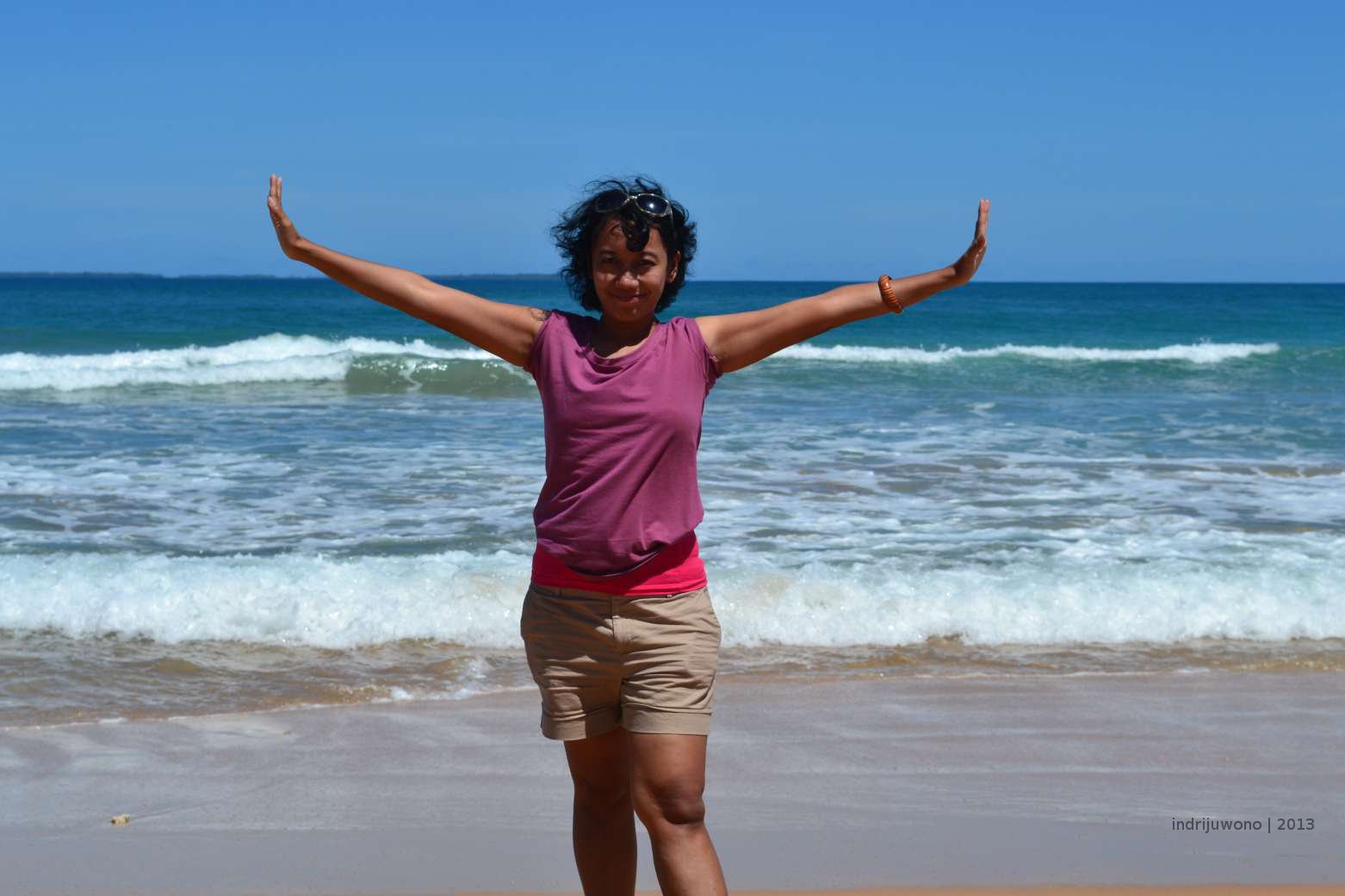 Takut hitam? Ah, basi itu. Di pantai tidak boleh takut hitam! Biarkan matahari menerpa kulit yang sudah terlindungi sunblock. Lengan lembab terlihat berkilau di udara terik itu. Uih, seandainya ini pagi, asyik sekali pasti bermain debur-debur ombak di laut. Sesekali aku berlari ke laut menyongsong ombak yang berpecahan.