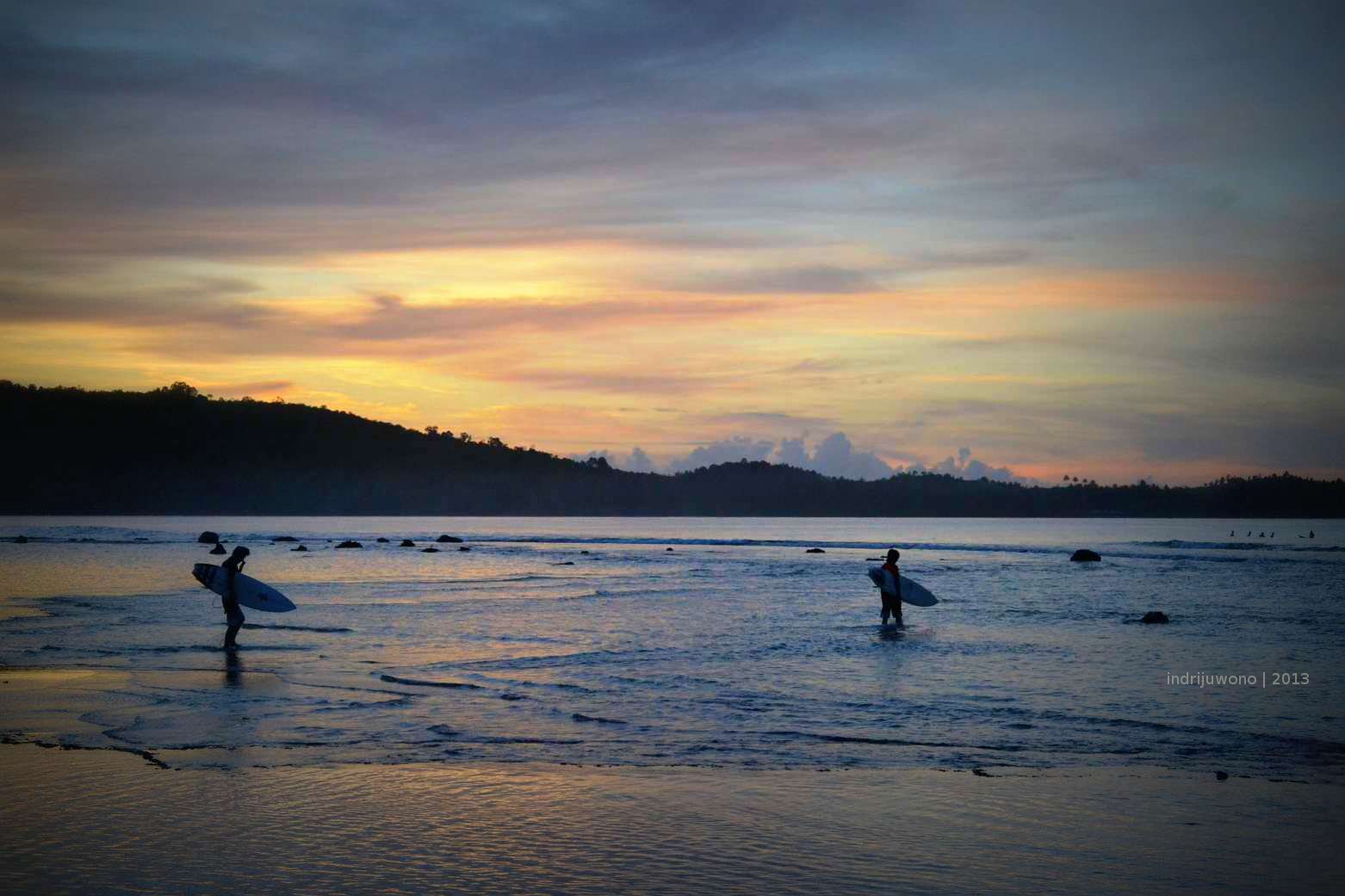 “Itu di tengah laut, harus naik kapal ke salah satu pulau di sana, baru sampai ke dekat gelombang-gelombang yang indah,” jelas Java yang pagi itu menggendong Keenan, putra sulungnya berjalan-jalan mencari matahari pagi yang sehat. Kami mengarahkan pandangan ke lautan. Beberapa peselancar bule menaiki ombak selama beberapa menit. Aku mengganti lensa kamera dengan tele, supaya bisa merekam gambar dari jauh. Seru juga rasanya berselancar.
