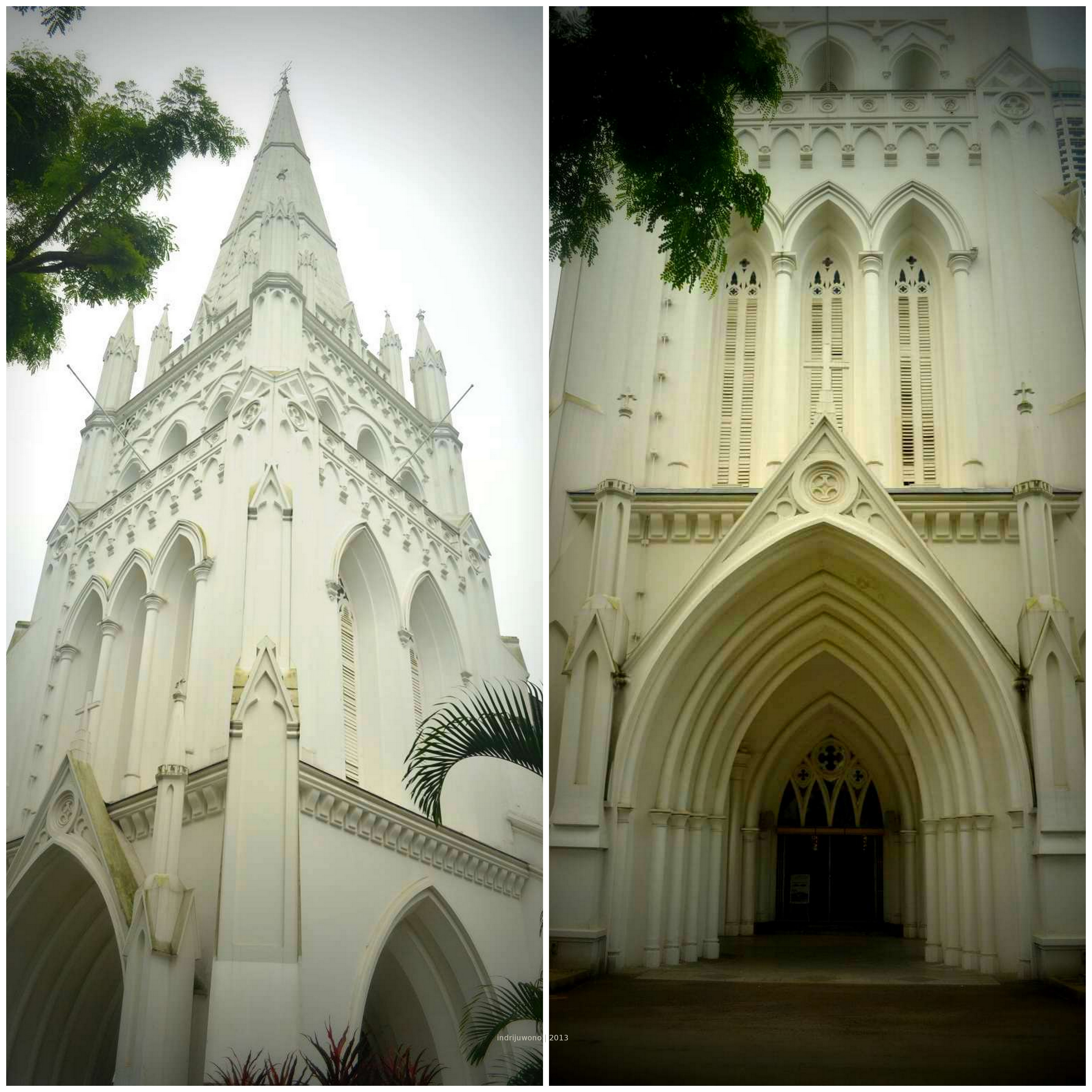 Aku bukan pemeluk Kristiani, namun bangunan bernuansa putih bergaya Neo Gothic yang dibangun tahun 1857 ini menarik minatku untuk melihat arsitekturnya. Dari depan pagarnya melalui pekarangan hijau yang luas, aku berputar sampai bagian depan dan melihat lengkung besarnya dengan kaca patri menghias jendelanya. Bangunan ini merupakan salah satu kebanggaan arsitektur Singapura dan ditetapkan sebagai monumen nasional pada tahun 1973.