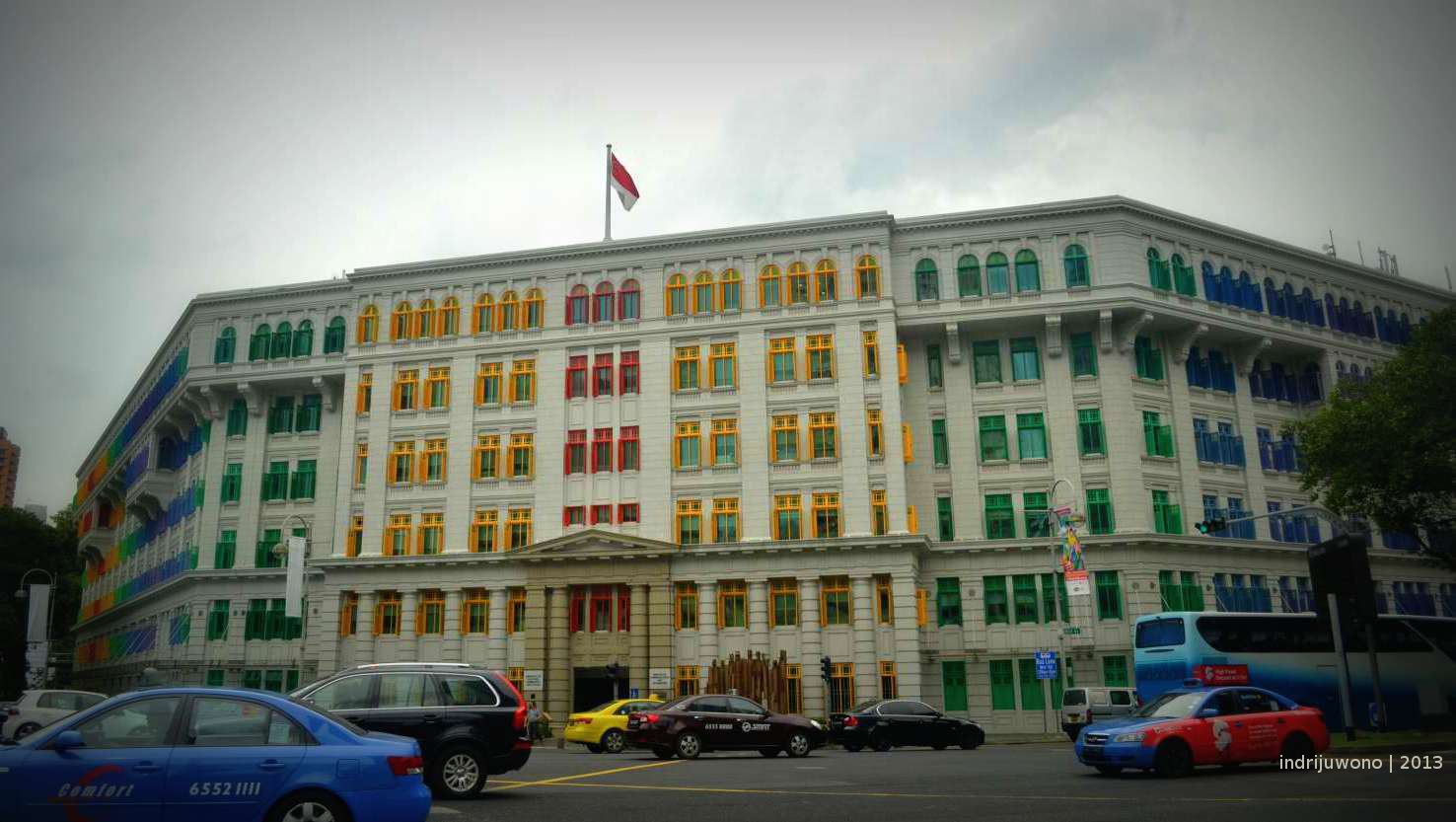 Usai menyusuri sungai ke arah utara, ternyata aku menemukan bangunan warna-warni di seberang jalan yang ternyata adalah Kantor Polisi. Dengan dinding berwarna putih bergaya kolonial, seluruh jendela kayunya dicat berwarna-warni merah, kuning, hijau, biru, sehingga meninggalkan kesan seram yang biasanya didapatkan ketika berada di kantor polisi. Jangan salah, hukum di sini amatlah ketat.