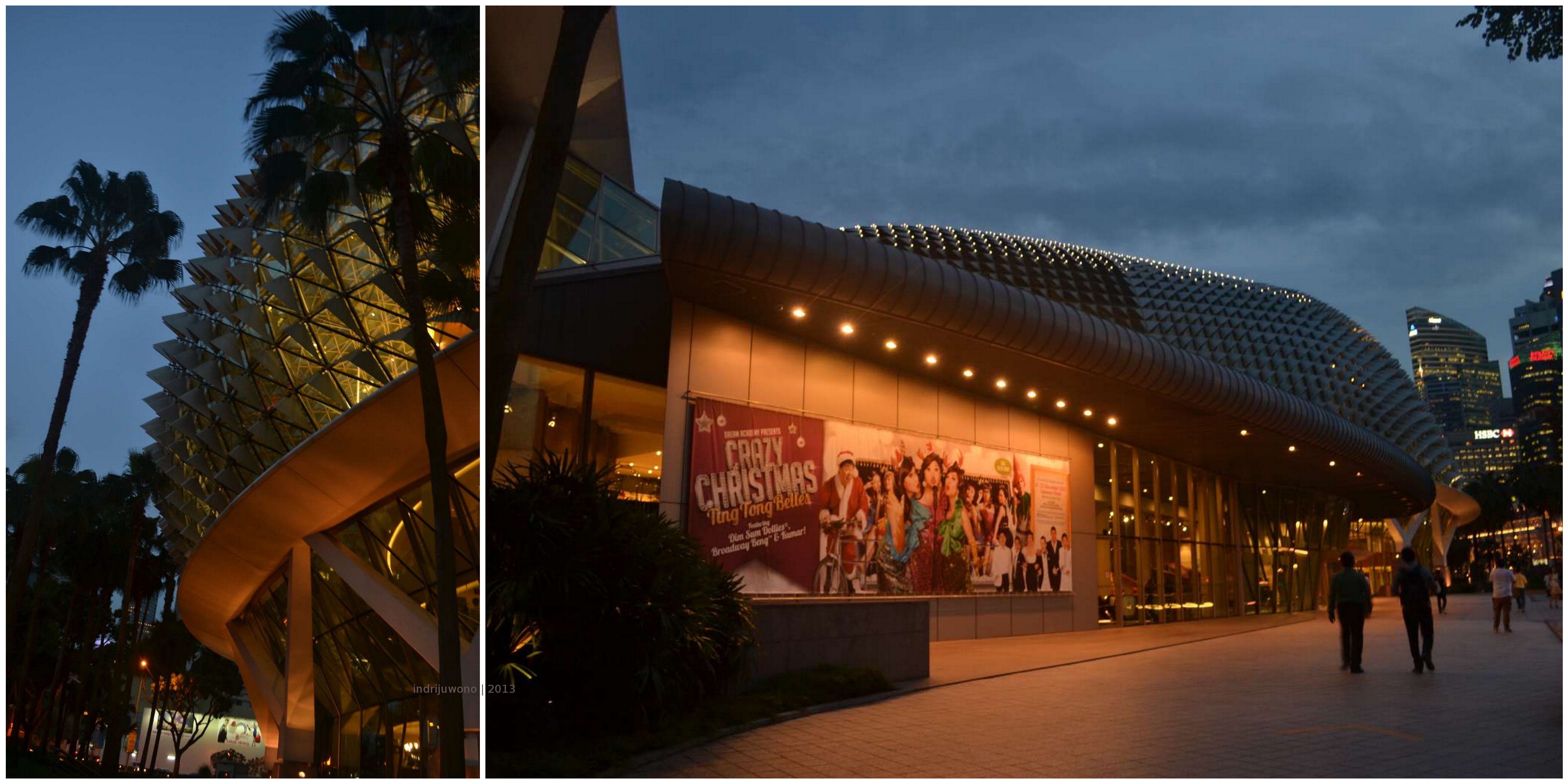 Aku melanjutkan jalan kaki hingga Esplanade, bangunan berbentuk durian itu nampak perlahan-lahan dari balik bangunan sebelumnya. Setelah menyeberang jalan lewat terowongan, tibalah di depan gerbang Esplanade dan melihat sirip-sirip baja yang mengalirkan pengudaraan sehingga terlihat seperti durian. Sirip-sirip berbentuk segitiga itu disusun teratur mengellilingi rangka penutup bangunan yang berbentuk oval. Di bagian bawah, bentuk oval itu disangga oleh kolom berbentuk V yang melingkar mengelilingi ‘cincin’ yang melingkari sepertiga bawah bentuk oval ini.