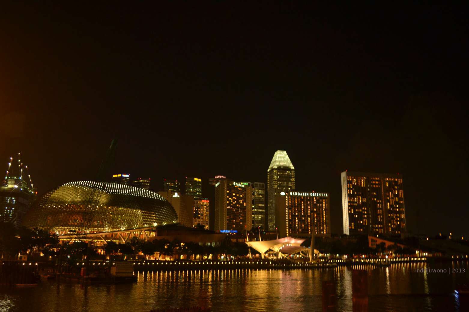 Keluar dari gedung durian itu, aku melalui danau besar yang dijadikan sebagai tempat pengolahan air bersih Singapura. Di seberangnya terdapat gedung Marina Bay Sands yang terkenal, dan Art Science Museum yang berbentuk kelopak bunga. Patung Merlion lambang negara Singapura sudah tampak di ujung jalan yang kususuri. Tak sampai 5 menit aku sudah sampai di Merlion Park ketika hari sudah beranjak gelap.