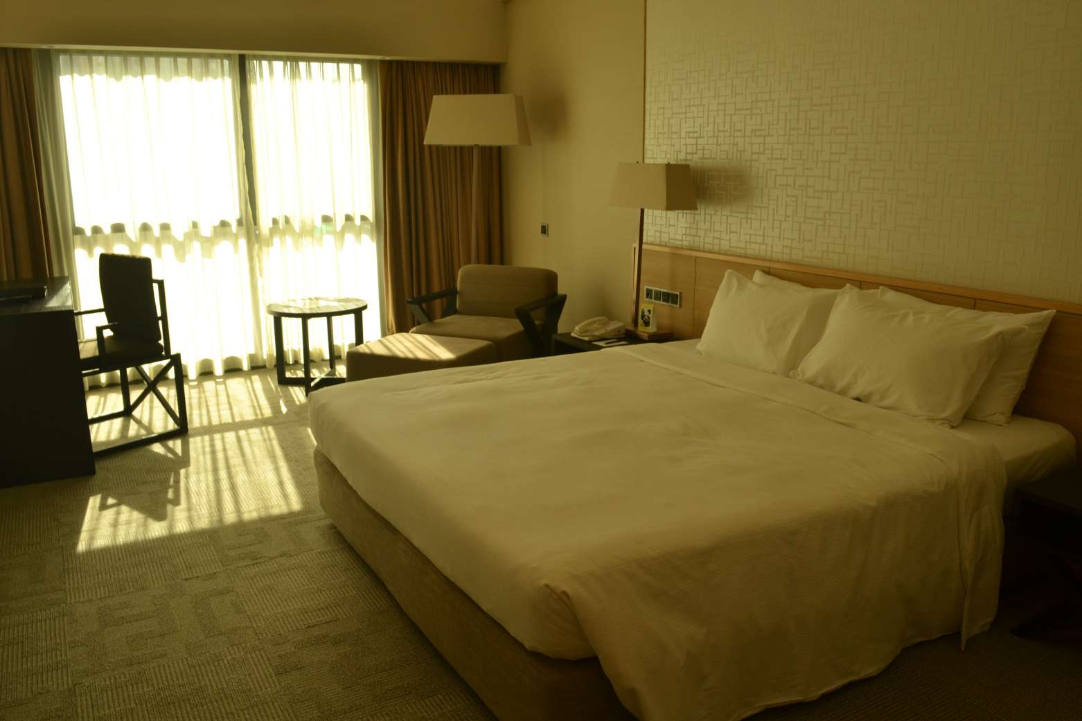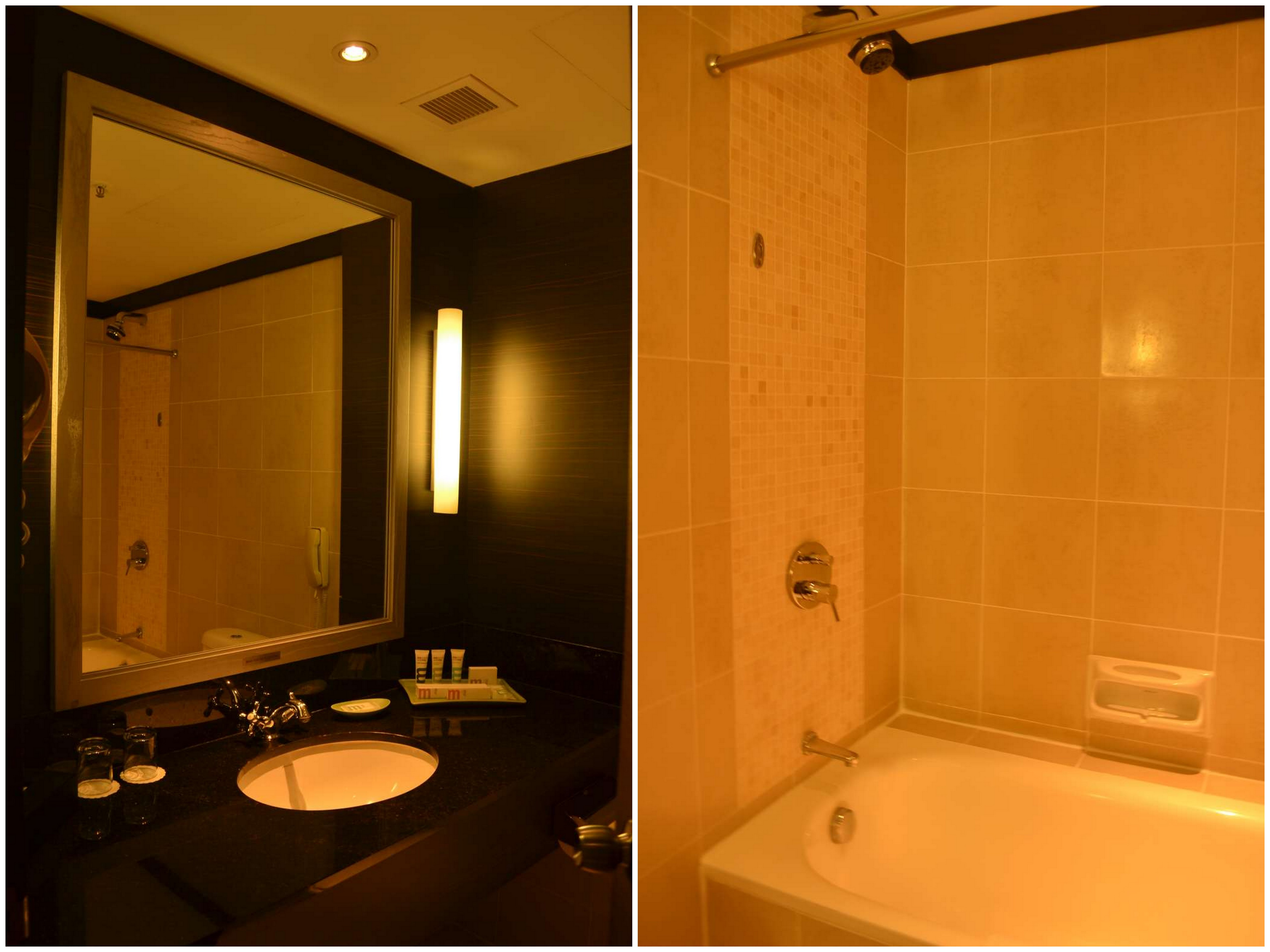Aku naik ke lantai 8 dan tiba di kamar yang menghadap ke jalan raya. Ukurannya cukup besar untuk sendiri, 4×8 m dengan satu double bed dan satu meja tulis juga sofa panjang untuk bersandar. Kamar mandinya dilengkapi dengan bathub dan vanity counter dengan table top granit hitam. Ada fit-out lemari yang berlapis HPL motif kayu juga dengan security box di dalamnya.