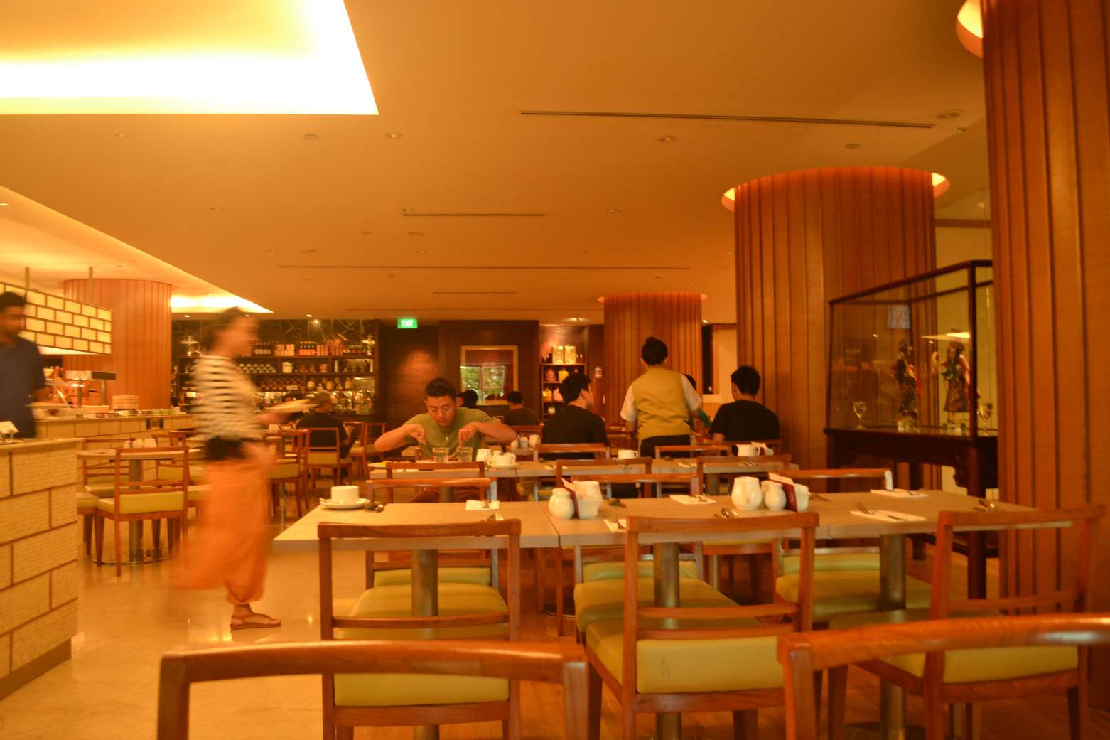 Ruangannya bernuansa kayu yang hangat. Terdapat banyak meja berkapasitas 4 atau 6 orang. Lantainya pada umumnya marmer, hanya ada beberapa lokasi sebagai pathway dipasang lantai kayu. Aku duduk di meja untuk 4 orang sehingga cukup untuk mengambil sarapanku yang lumayan banyak. Karena akan banyak berjalan kaki hari itu, tentunya lebih baik mengisi energi dulu sebelumnya bukan?