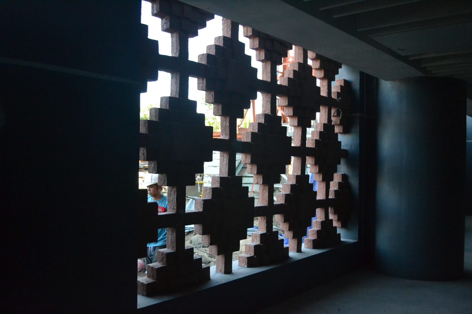Yang membuat menarik, lubang-lubang pencahayaan dibuat dengan pola silang menggunakan batu bata ekspos dengan warna terakota. Dinding bata ini disusun dengan pola yang menimbulkan permainan cahaya di dalamnya. Terasa sekali aroma Indonesia dengan dinding warna tanah ini.