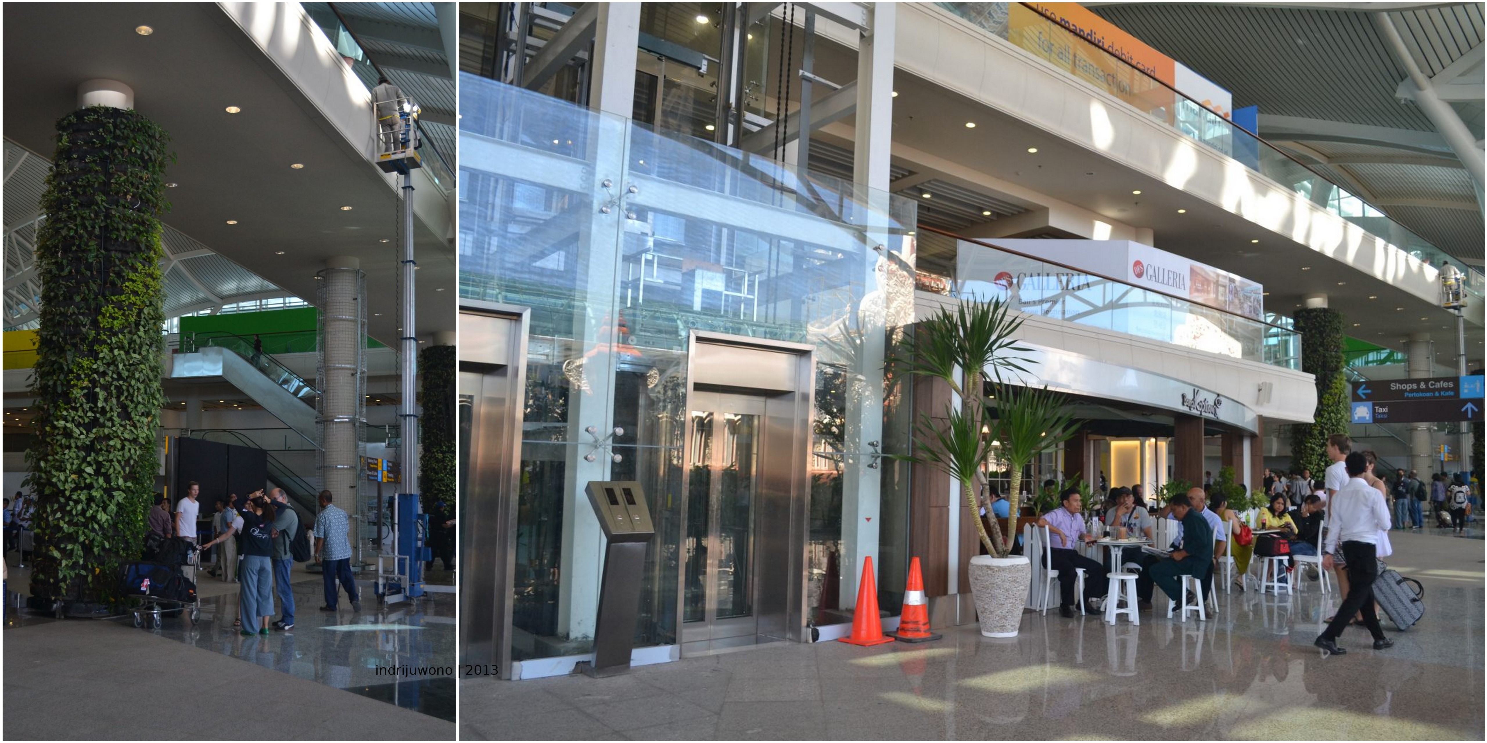 Usai berkeliling, kami turun menggunakan lift dan kembali ke lantai dasar yang makin ramai saja. Banyak supir taksi yang duduk-duduk beristirahat menunggu penumpang di hall yang berhadapan dengan taman ini. Beberapa kolom dipercantik dengan rangka untuk menumbuhkan tanaman rambat. Tentu tidak sulit, karena sinar matahari yang berlimpah di dalam bandara ini bisa menjadi makanan yang bagus untuk tanaman.