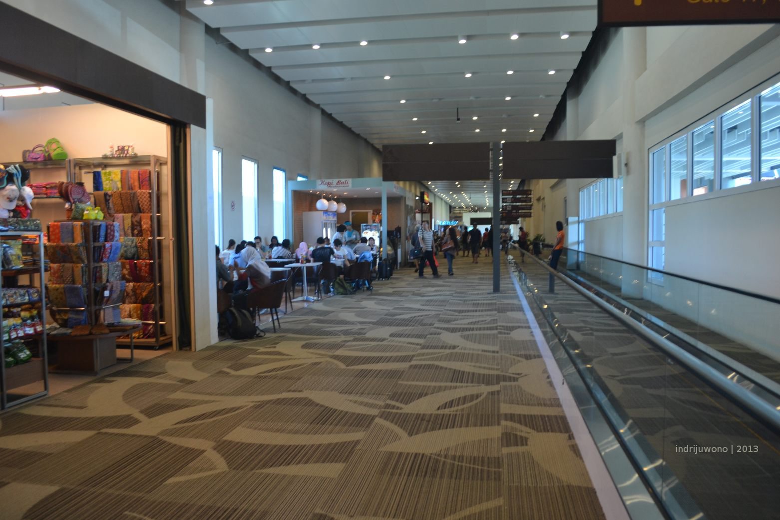 Koridor ini cukup menarik, lebarnya 8 meter seharusnya cukup, namun banyaknya gerai makanan di samping kirinya menjadi ruang berjalan menjadi agak sempit. Belum lagi ada beberapa conveyor jalan di sisi kanan yang mempersempit area berjalan ini. Aku sudah beberapa kali melalui koridor ini apabila hendak kembali ke Jakarta selalu mendapati hal yang sama. Ruang tunggu keberangkatan yang sempit dengan jumlah kursi yang tidak memadai membuat penggunanya memilih untuk ‘ngemper’ di koridor.