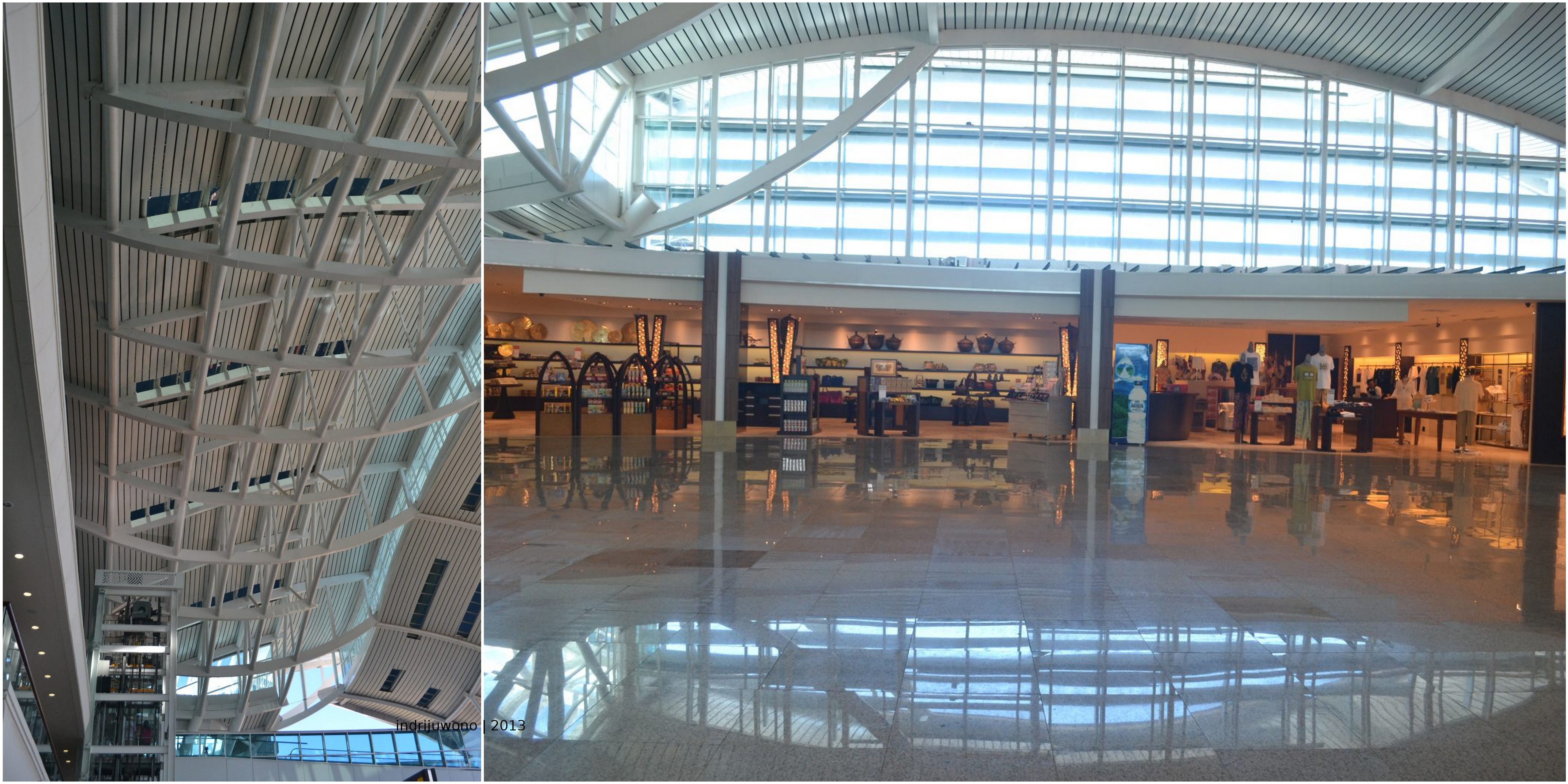 Kami tiba di area hall area kedatangan bandara internasional baru yang didominasi oleh material alumunium berwarna silver. Koridor bawahnya yang lebar cukup ramai oleh pengguna yang hendak bepergian ke luar negeri pagi itu. Atap didominasi lengkung seperti cangkang-cangkang dengan rangka batang yang memperkuat strukturnya. Tiang-tiang kolom berbentuk bulat berdiri langsing menopang rangka atapnya. Ada enam tiang bulat yang melingkar membentuk kolom besar yang di tengahnya terdapat taman dengan sinar matahari langsung hingga lantai dasar.