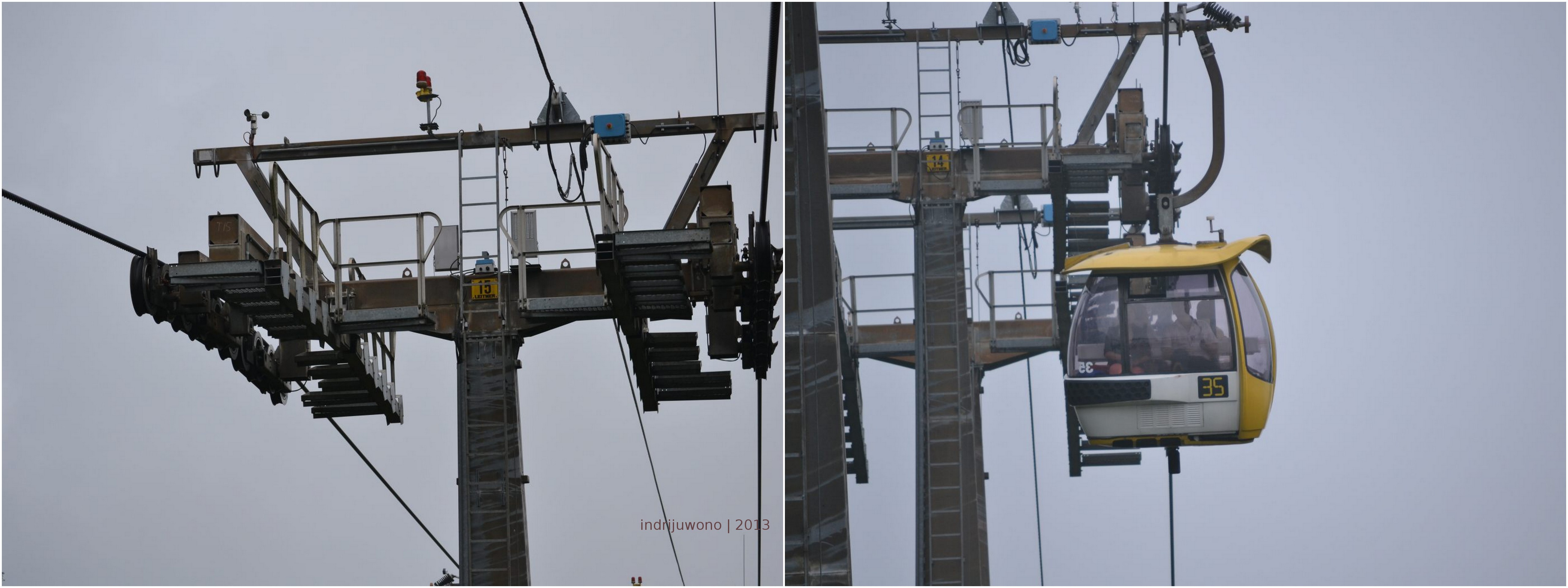 Salah satu yang kusuka di negeri ini adalah petunjuk-petunjuknya yang jelas. Sehingga aku yang pemalu ini tidak perlu banyak bertanya kiri kanan ketika sampai di satu tujuan. Tinggal membaca petunjuk maka kita bisa sampai gate yang ingin dituju. Tanpa banyak bertanya aku sampai ke tempat harus naik kereta gantung. Udara mendung dan berkabut ke di luar ketika aku masuk ke kereta berkapasitas empat orang itu.