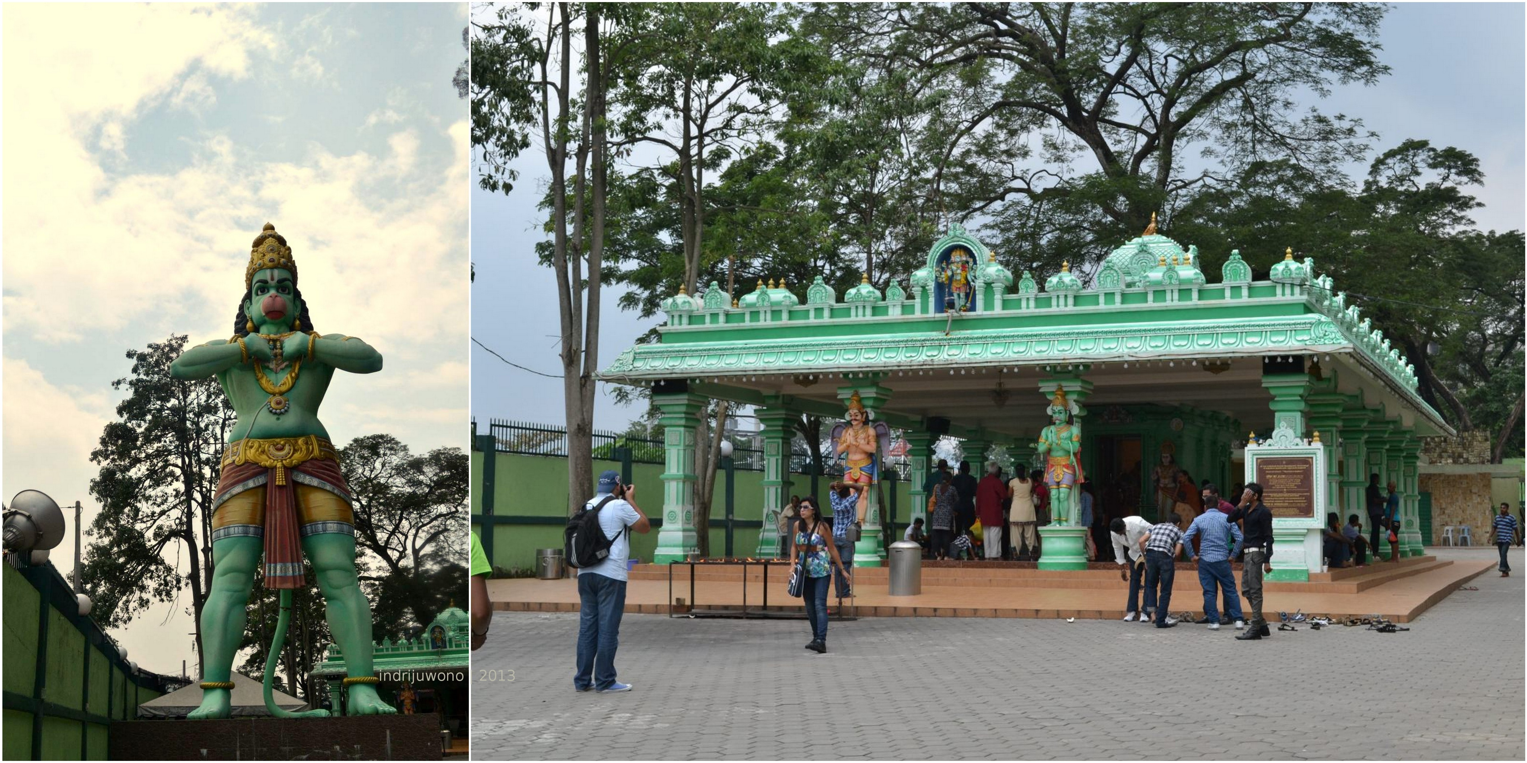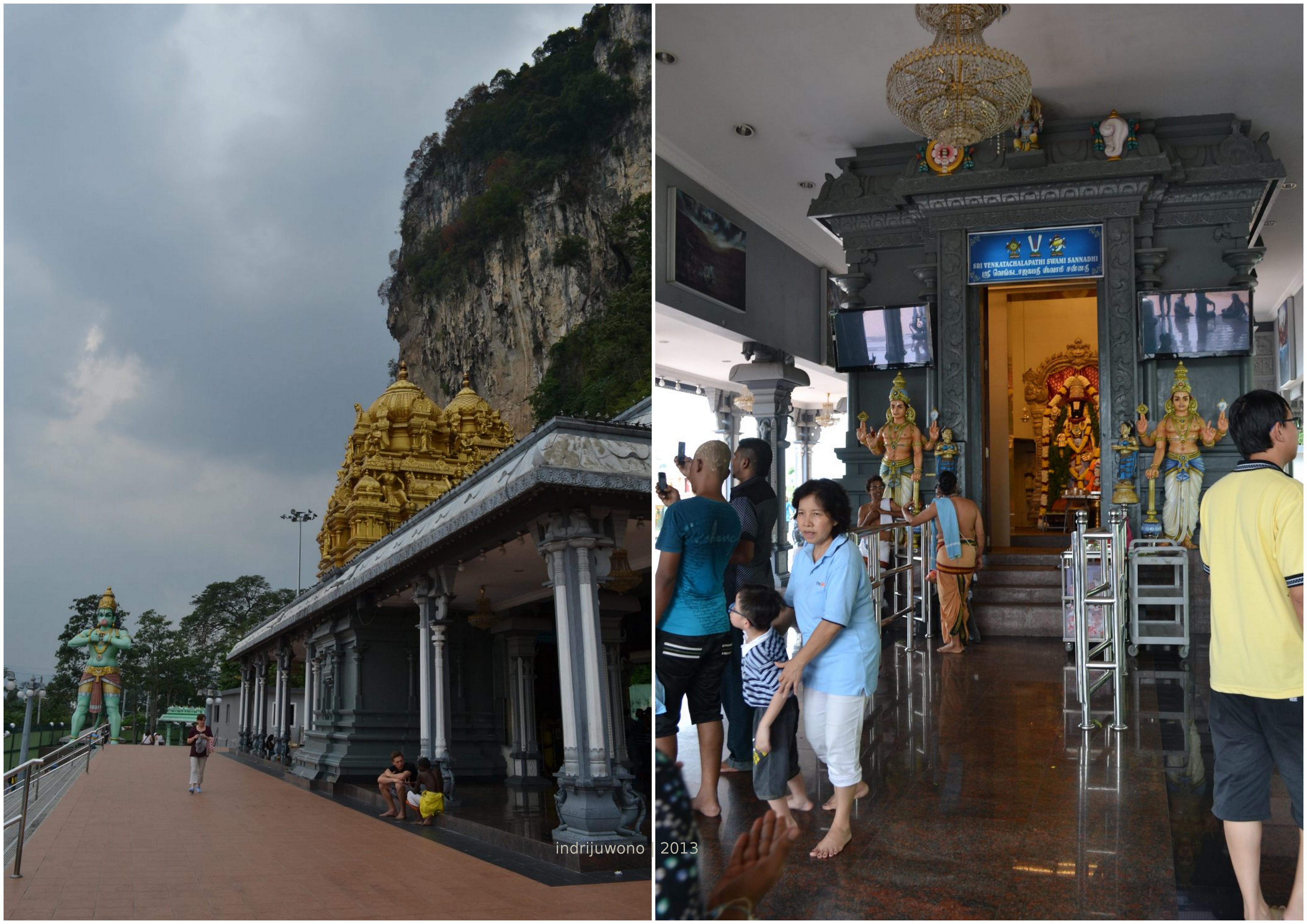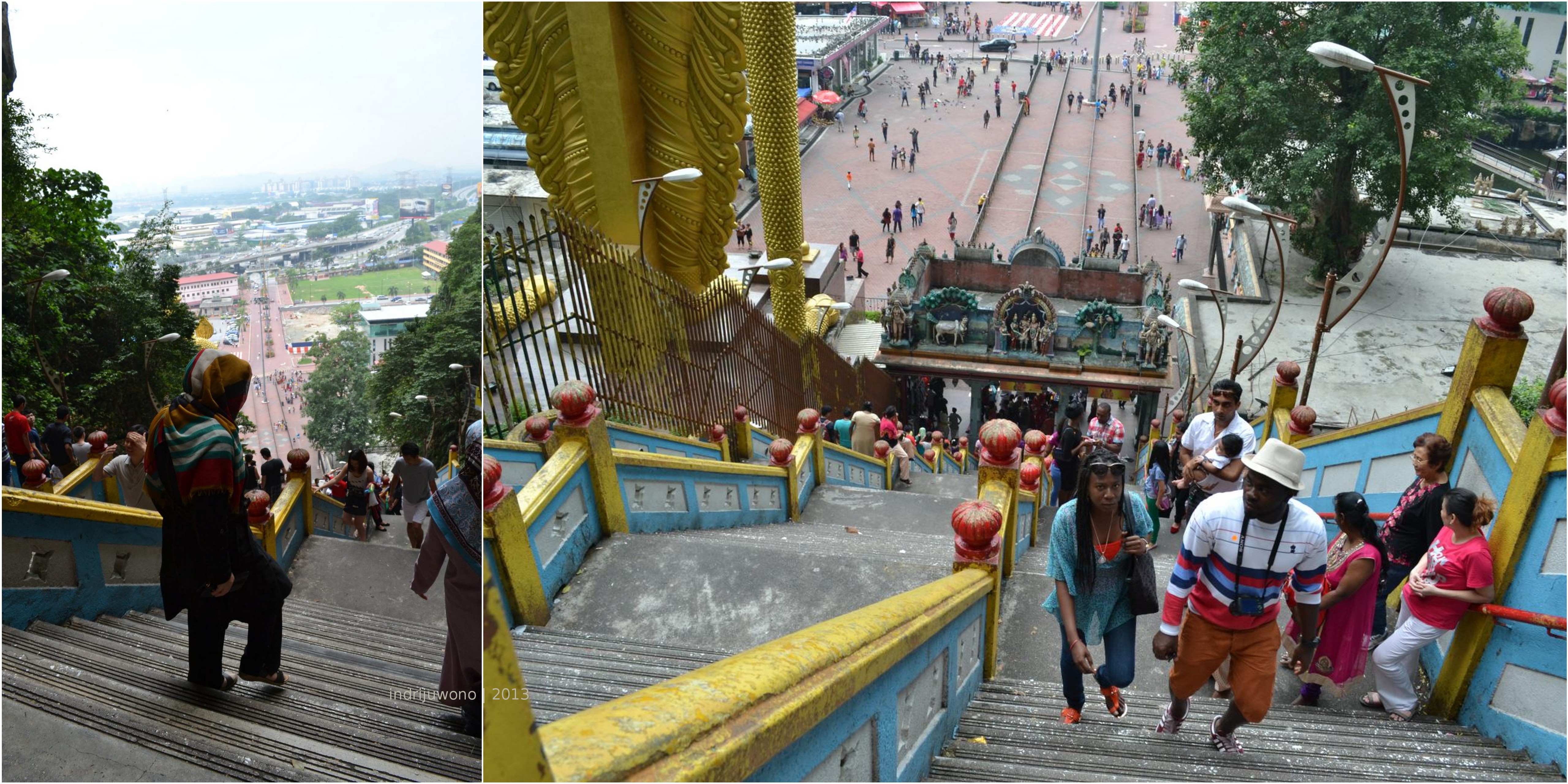Turun dari kuil itu aku berjalan berkeliling, baru tampak olehku mulut gua Batu Cave yang, waw! Tinggi di atas sana!