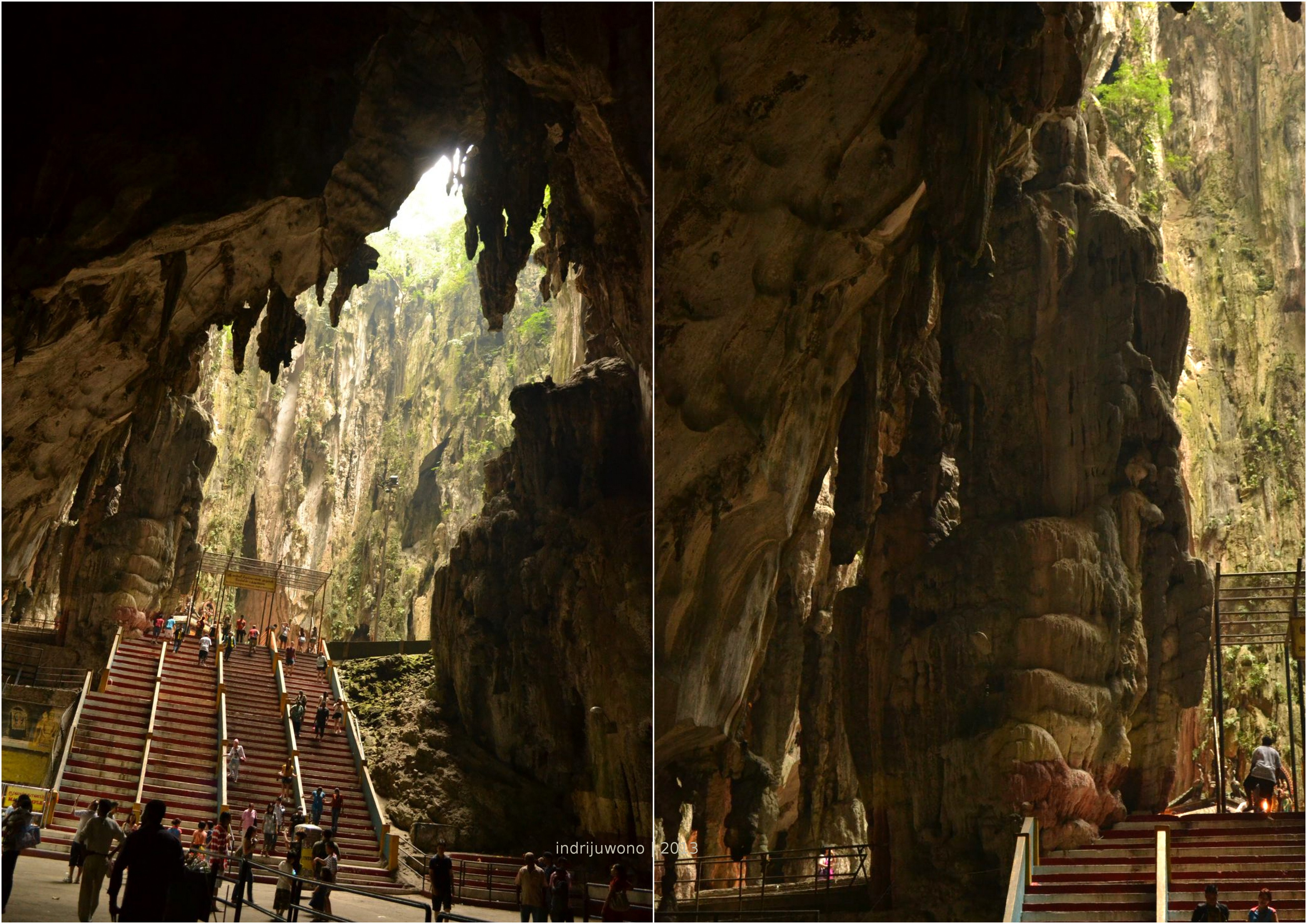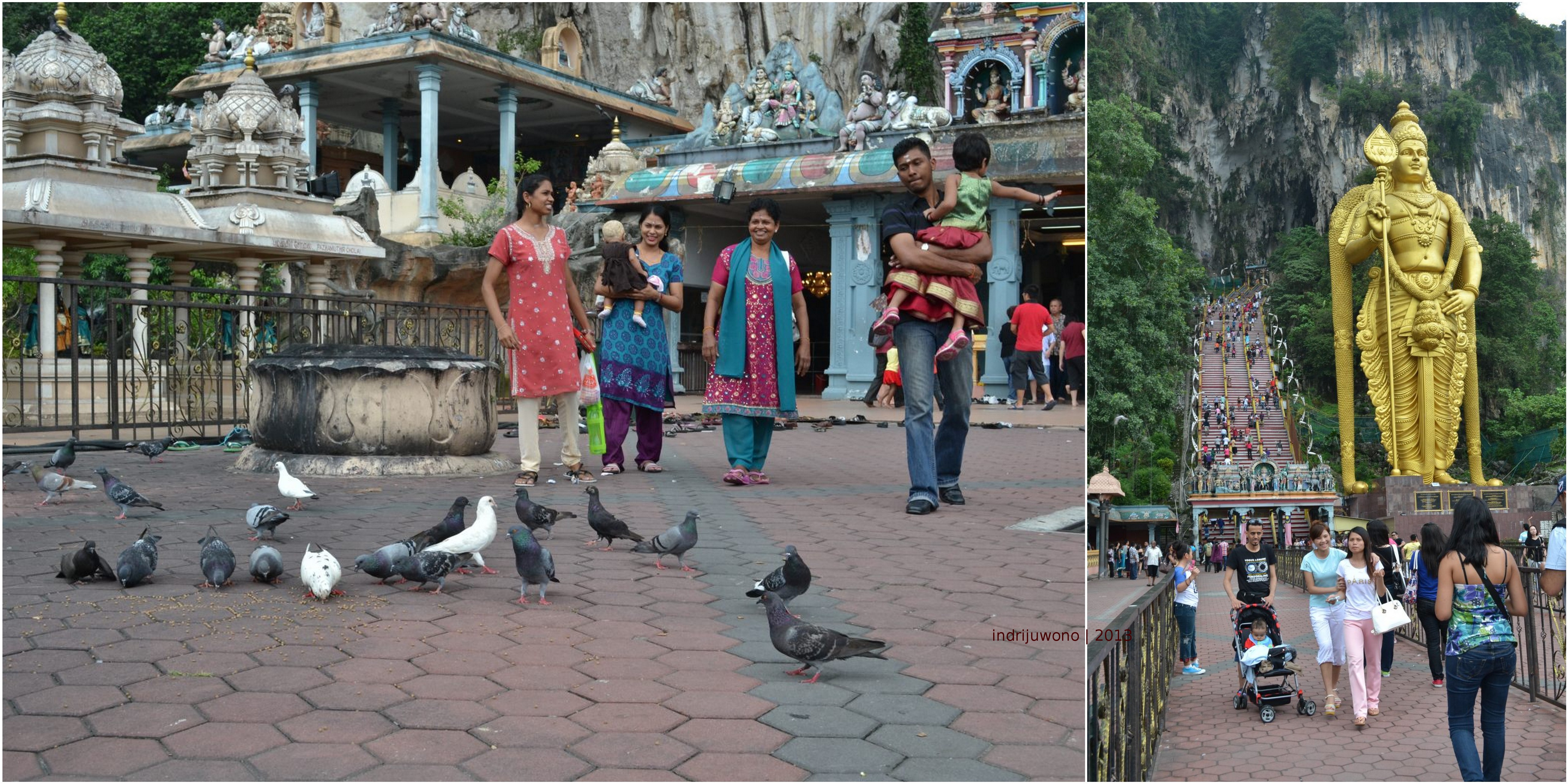 Ada pelataran yang dipenuhi burung merpati mengawali perjalanan mendaki ratusan anak tangganya. Sebuah patung Dewa Murugha besar berdiri di sampingnya, menjadi latar menarik untuk difoto. Setelah berfoto-foto sejenak, aku melompat-lompat kecil dan mulai menaiki satu per satu anak tangga ini. Air mineral sudah kusiapkan di sisi kanan ranselku. Huih! Mungkin butuh hampir setengah jam untukku mencapai mulut goa.