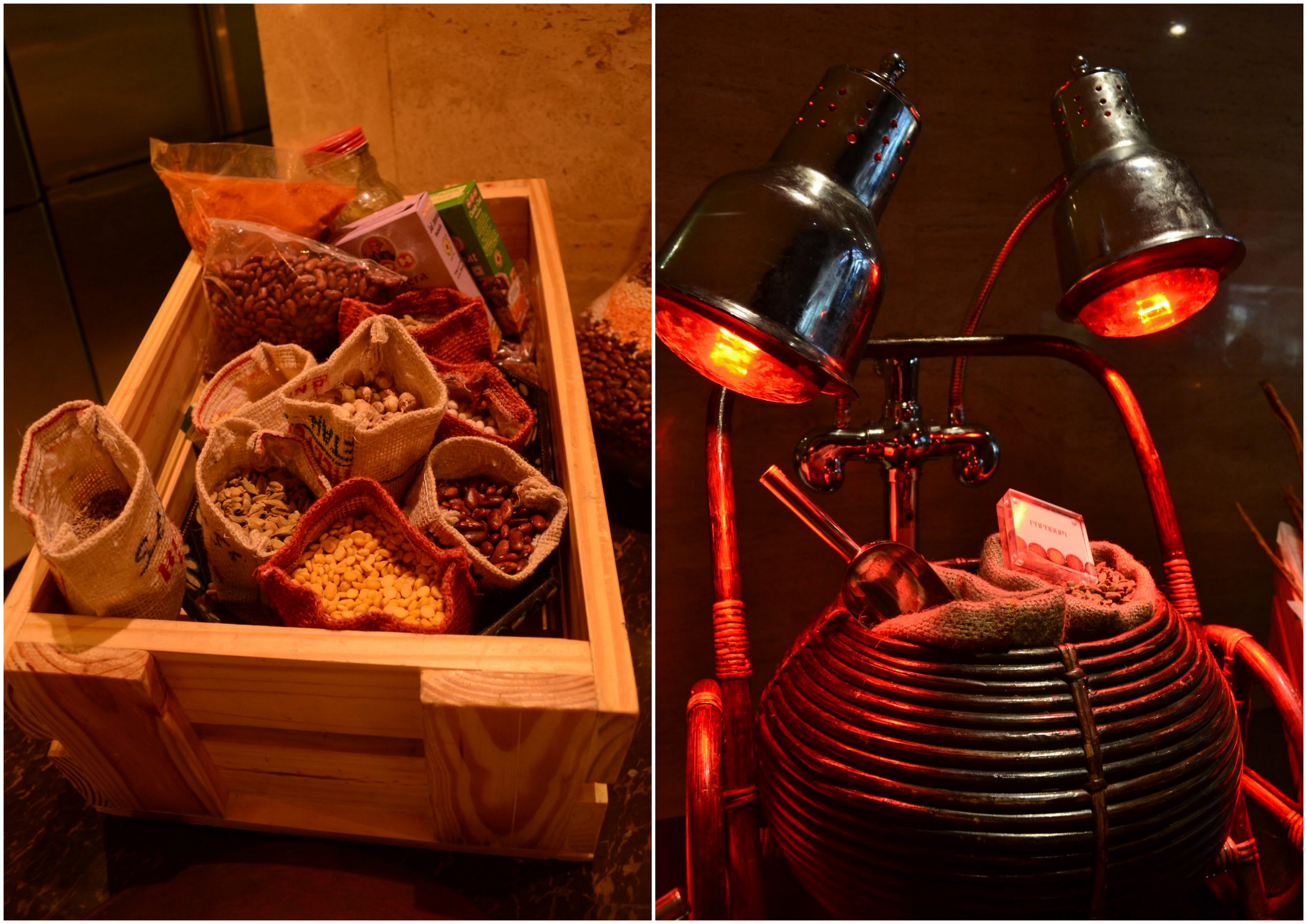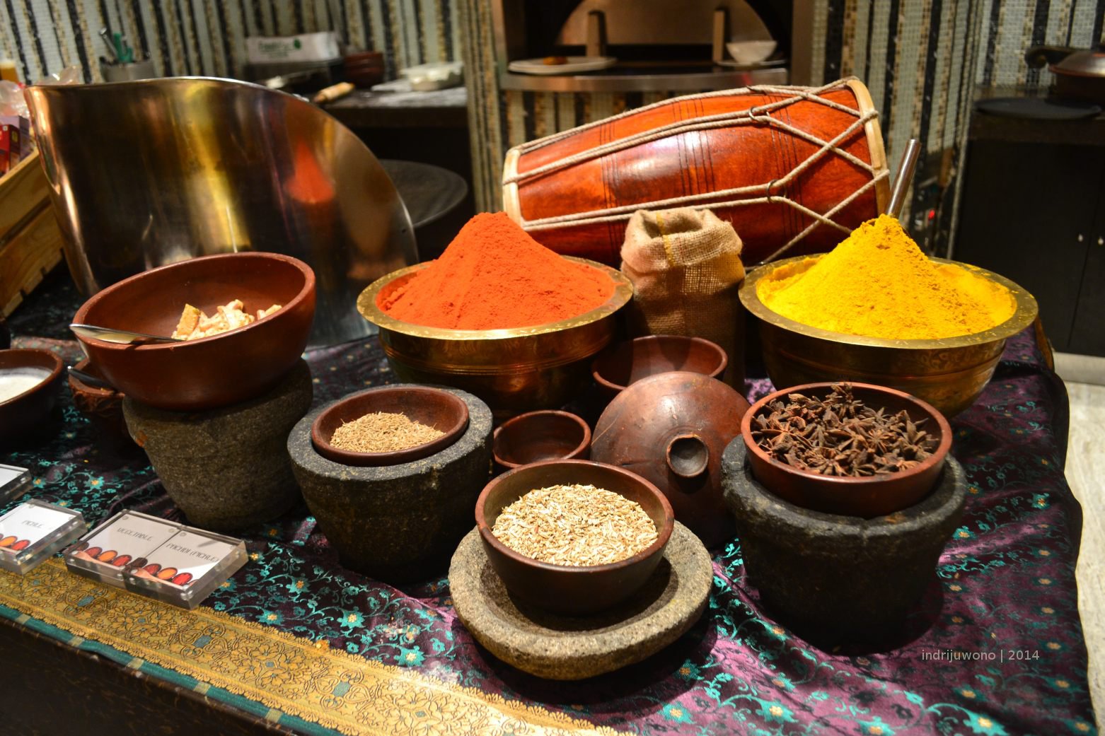Selain buffet berisi masakan, di tepi-tepinya juga diletakkan berbagai bumbu masakannya berwarna-warni, baik bumbu berbentuk butiran, ataupun yang sudah dihaluskan menjadi bubuk. Bumbu-bumbu ini tersedia juga di dapur restoran, ada juga yang dibawa langsung oleh kokinya dari India. Warna-warnanya yang mencolok membuat hasil masakannya berwarna cerah juga.
