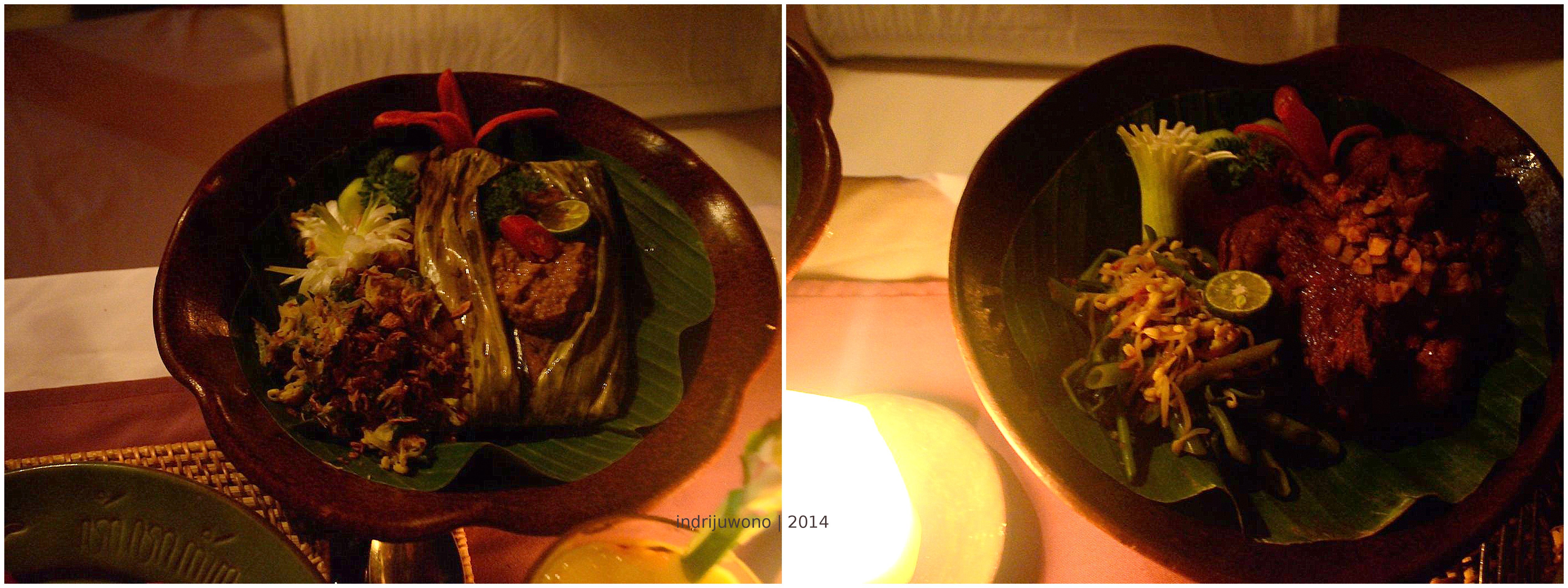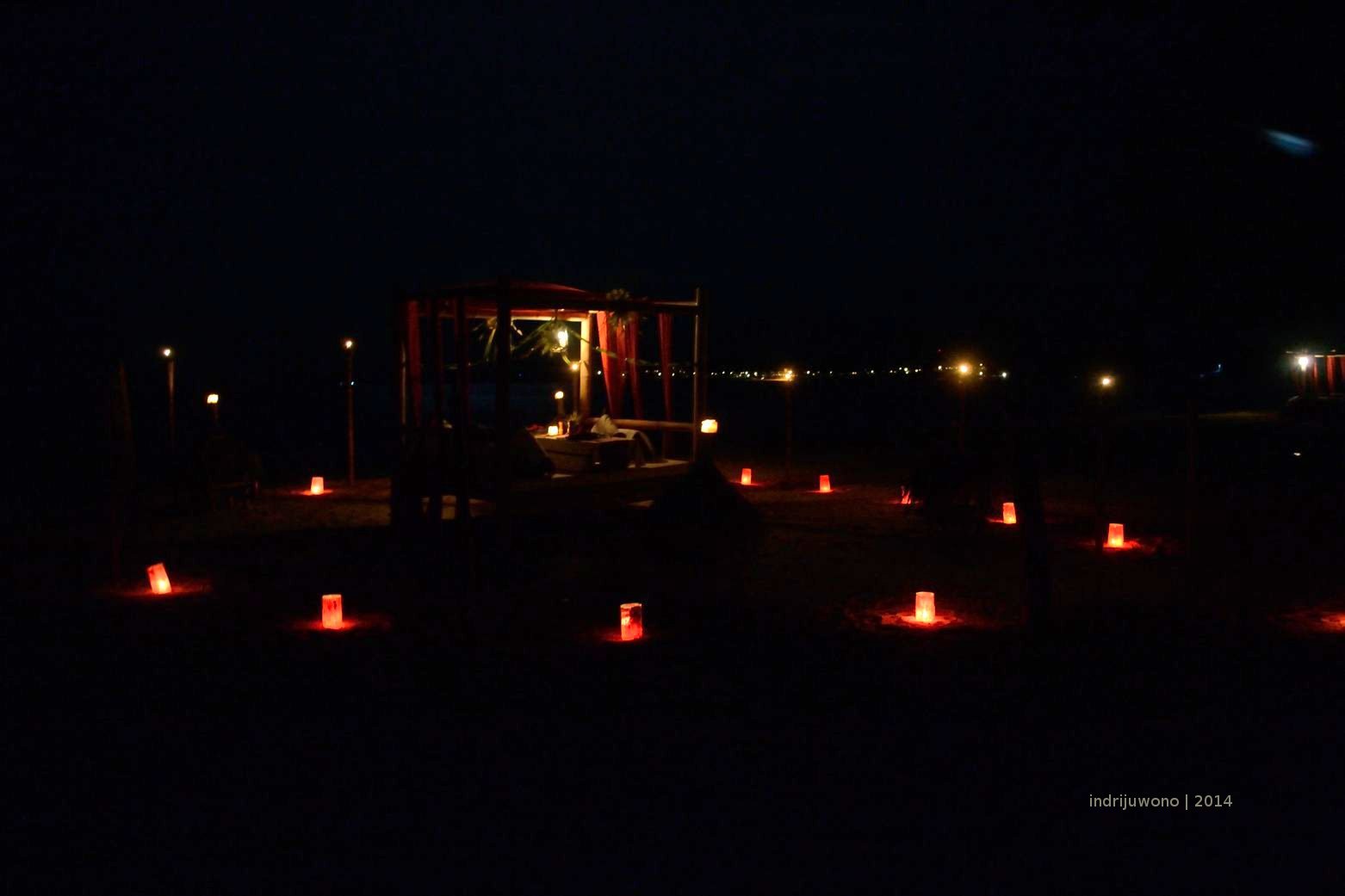 Ada beberapa makan malam yang bisa dicoba di perfect hideaway ini. Di puncak candi bisa disiapkan candle light dinner romantis di bawah langit terbuka. Sepanjang tangga ditemani oleh lentera-lentera kuning yang menuntun jalan sampai ke meja cantik yang ditata untuk dua orang. Atau menikmati pantai di bamboo bed yang dikelilingi lilin dan kelambu merah menggantung? Pasti akan menjadi pengalaman yang tak terlupakan. Apalagi di bawah sinar bulan purnama yang cahayanya jatuh tercermin di laut yang tenang. Tentu saja, sinar bulan tak masuk daftar menu.