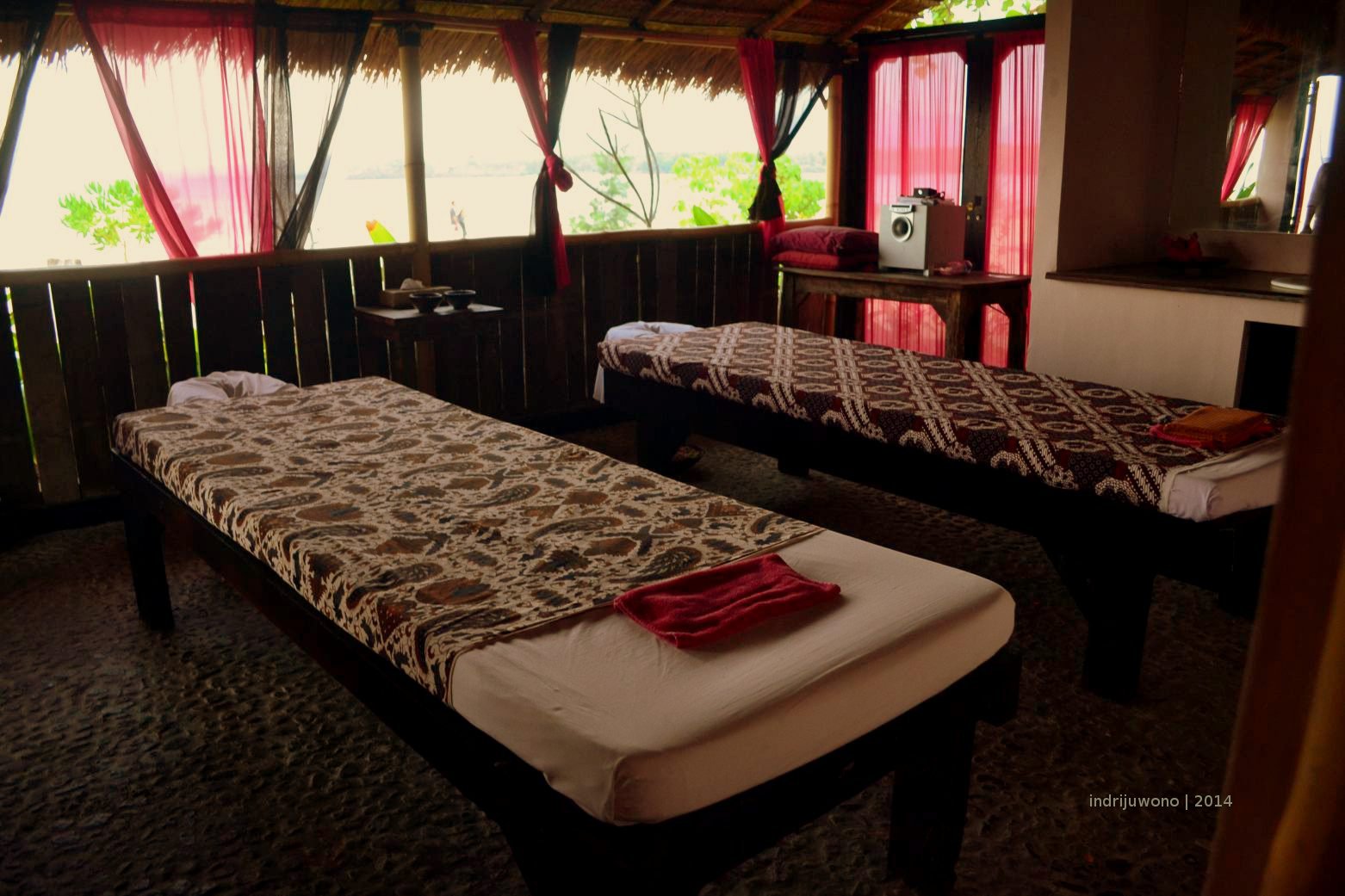 Melewatkan senja yang temaram, bale spa di tepi pantai bisa menyamankan punggung dan kaki yang lelah beraktivitas seharian. Bangunan bambu di ujung menghadap ke laut lepas tepat di batas pasir. Dua ranjang spa bisa melayani Javanese atau Balinese Spa, atau berbagai essens aromatherapy dengan pijatan ke seluruh badan. Atap rumbia dengan kuda-kuda bambu yang tinggi sebagai struktur penutup atapnya diikat pada tiang bambu pada keempat sudutnya. Dua kamar mandi melengkapi ruangan spa ini.