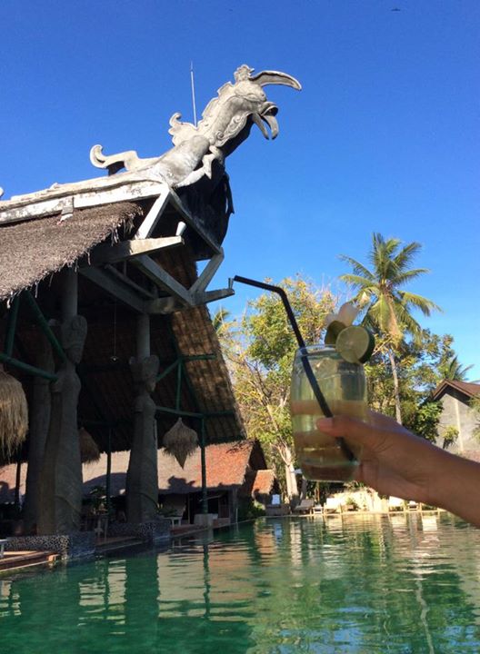 Kolam renang di tepi bale juga tak kalah unik. Memiliki tiga jalur memanjang sebagai perwujudan trisula sang Syiwa, sebagai infinity pool tepiannya didesain tak nampak dan air hanya mengalir jatuh ke saluran tepi kolam. Airnya tak henti mengalir, berkecipuk ringan jika ada yang berenang di dalamnya. Seperti kamar mandi yang didominasi warna hijau, keramik yang melapisi kolam ini pun bermotif sama. Di ujung-ujungnya terdapat tangga dari batu candi hitam untuk naik ke dek kayu. Jangan terkejut ketika berenang, karena beberapa patung ikut menemani di dalam tepi-tepi undakan.