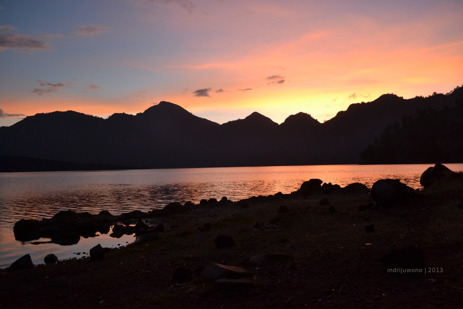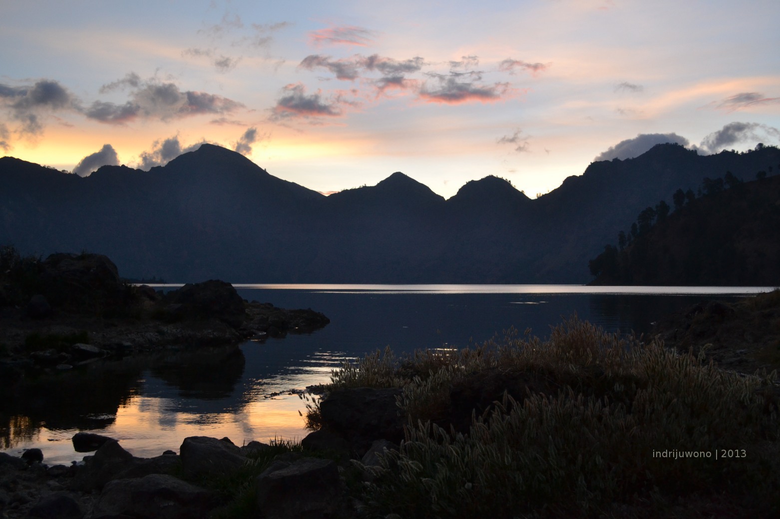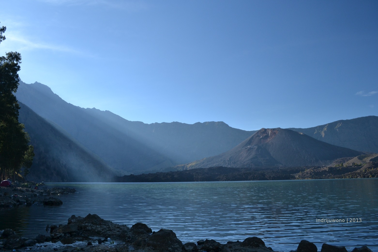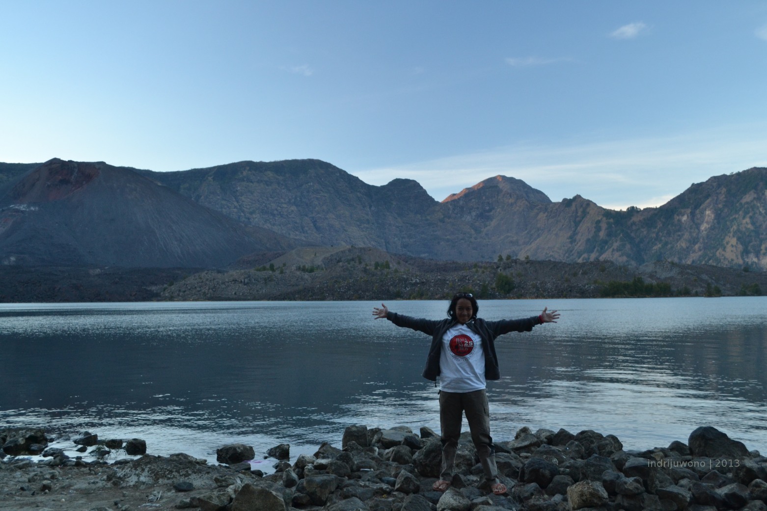 Menahan dingin, aku paksakan untuk mengambil gambar keindahan danau dengan anak gunung baru yang muncul di tengah-tengahnya ketika erupsi. Danau yang merupakan kaldera Rinjani itu memantulkan langit biru yang cantik dengan awan berarak.