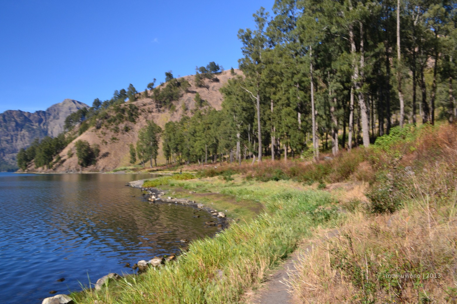 Tapi perjuangan menuruni lereng itu dibalas dengan keindahan yang setimpal. Padang ilalang yang ditemui sebelum hutan, mengerling keemasan dengan latar air danau di kejauhan. Tak sabar aku menuju tepi danau yang beriak-riak ringan dengan sepoi angin yang menderu tipis di telinga.