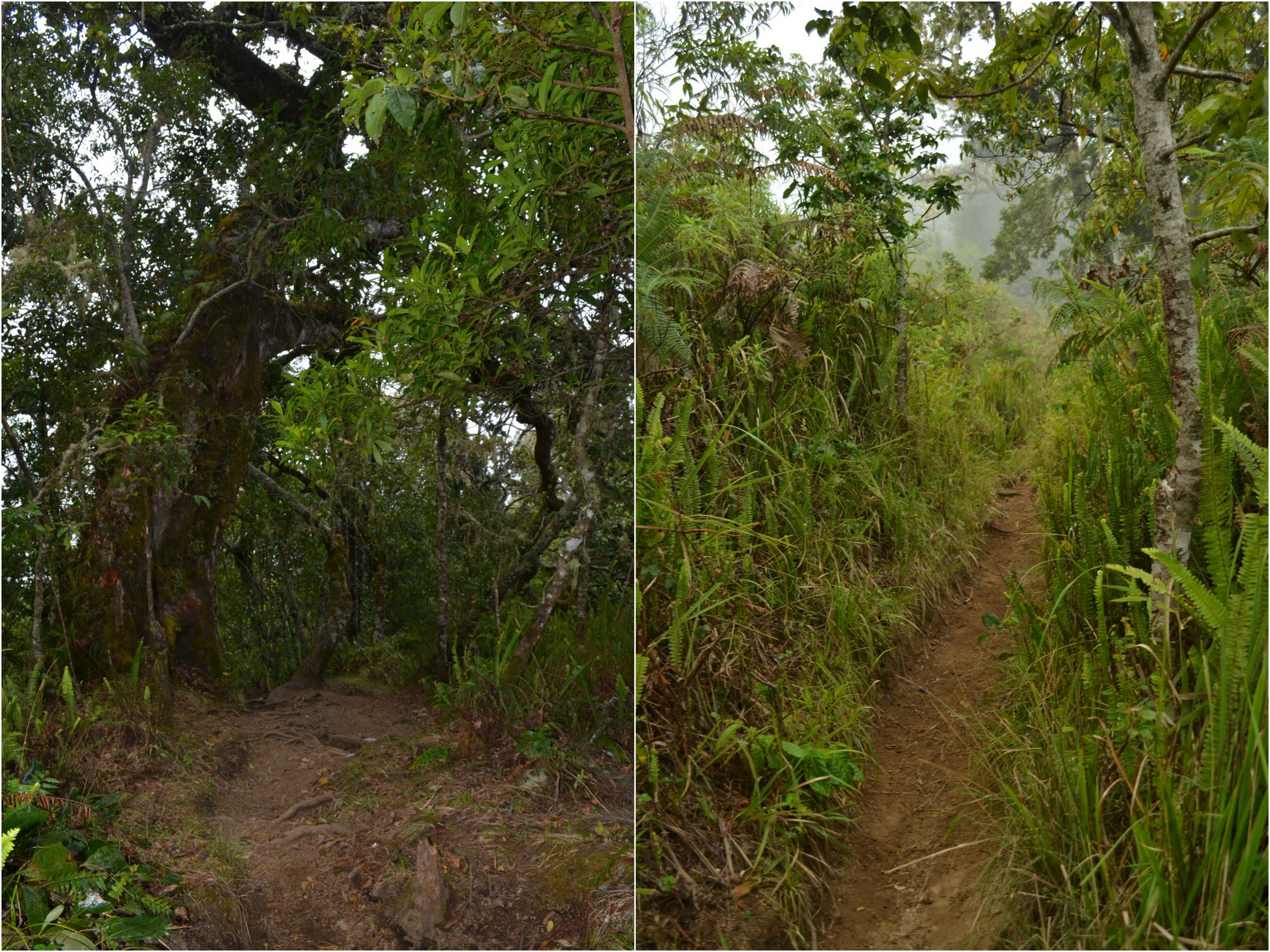 Tadi sempat kuamati bahwa di antara pos-pos istirahat tadi, jenis vegetasi di kiri dan kanan kami berubah. Sesudah savana kering di pos 3 atas tadi, dan pepohonan hutan hujan tropis, menjelang pos 2 banyak tanaman pandan-pandanan. Makin ke bawah vegetasi berkayu dengan akar-akar gantung dan tipis yang menyilangi jalan kami makin banyak. Salah satu petunjuk dekat pos 1 juga adanya beberapa pohon beringin yang tumbuh di jalur itu.