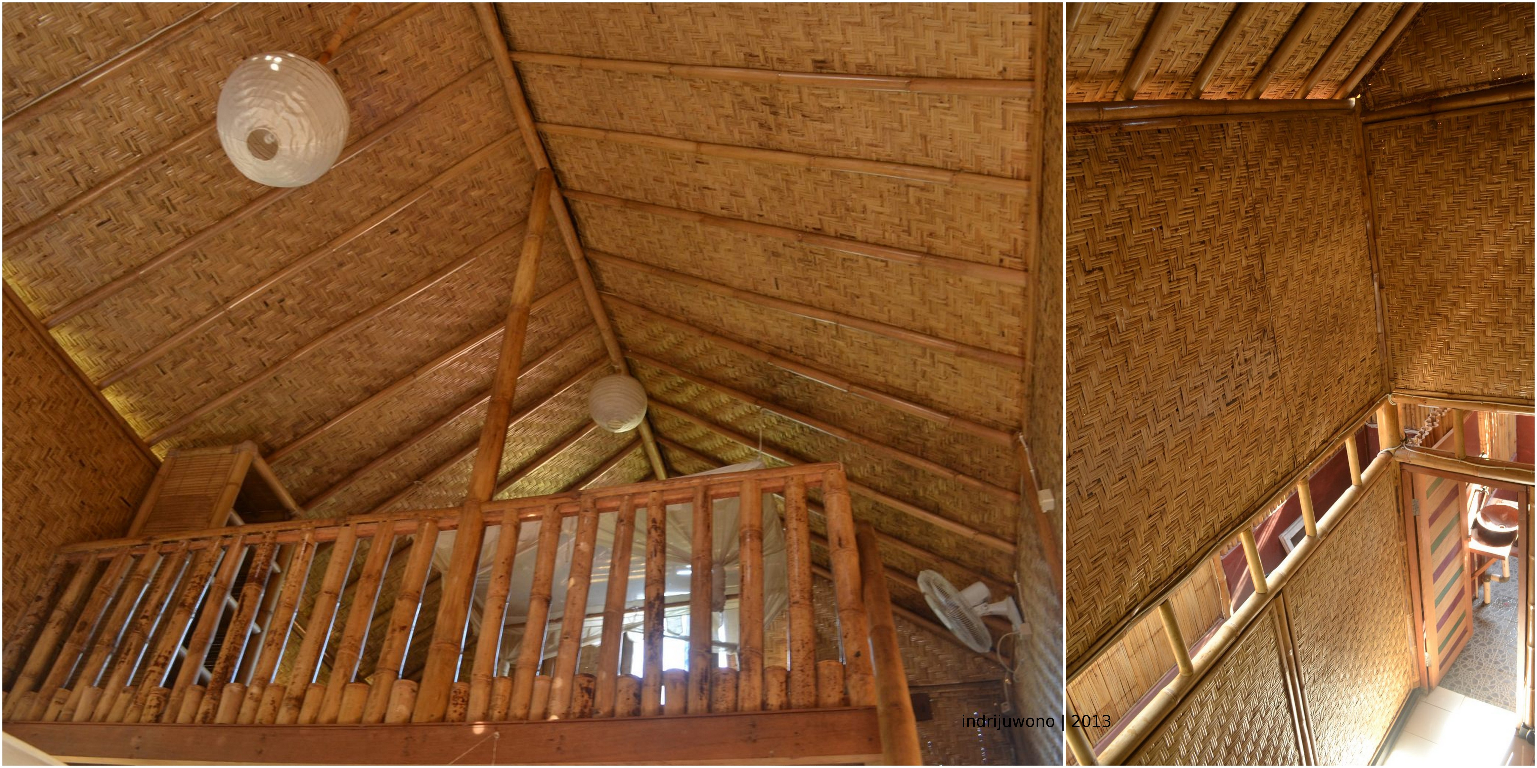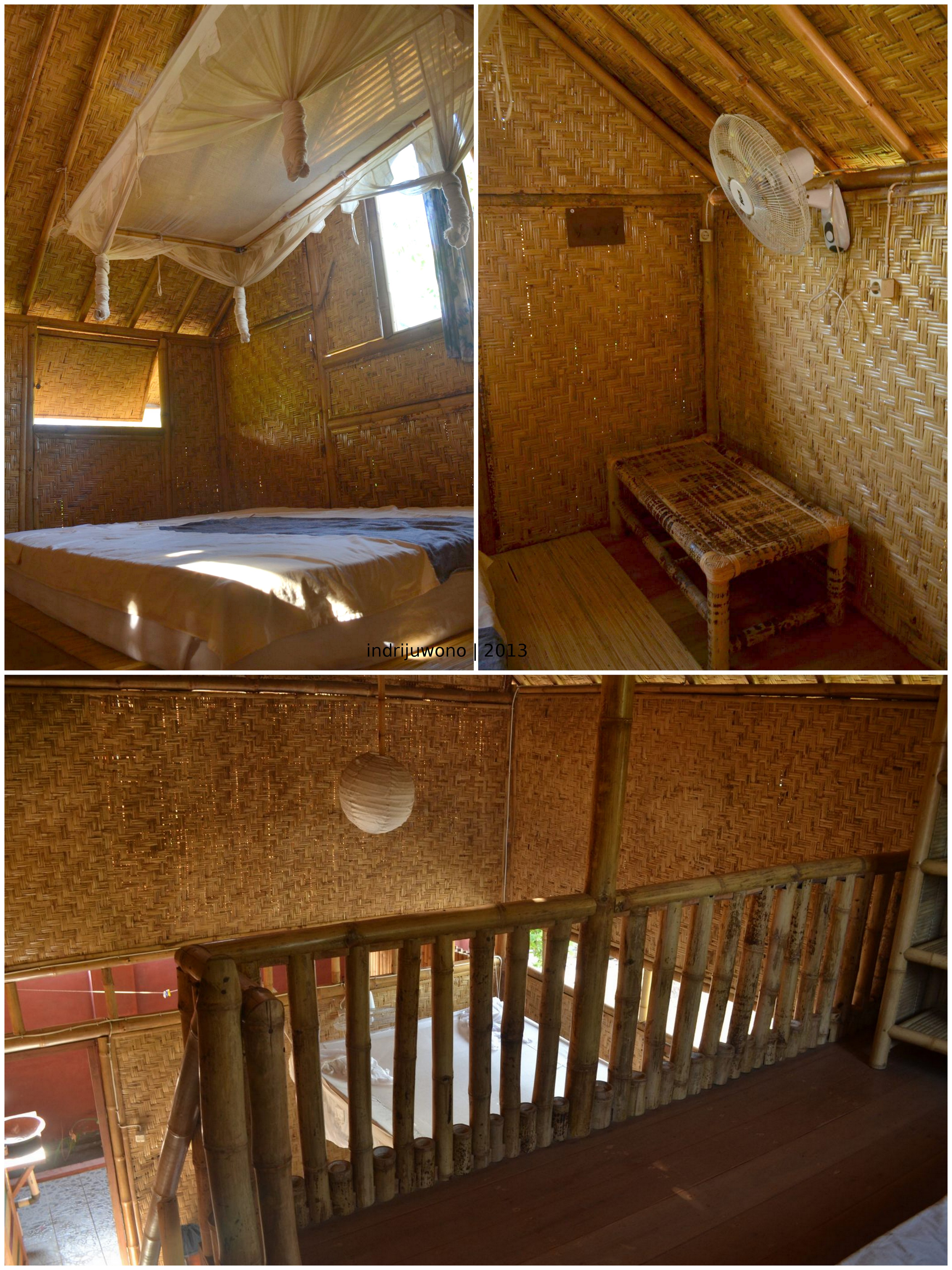 Overall this bungalow walls made of woven bamboo, with dark red tin roof. However, under the zinc installed insulation and sloping ceilings are also made of woven bamboo to minimize the usual heat is passed by zinc. The room is not using the AC, but the air easily slip from the cracks of woven bamboo. One fan in the wall can provide additional wind.