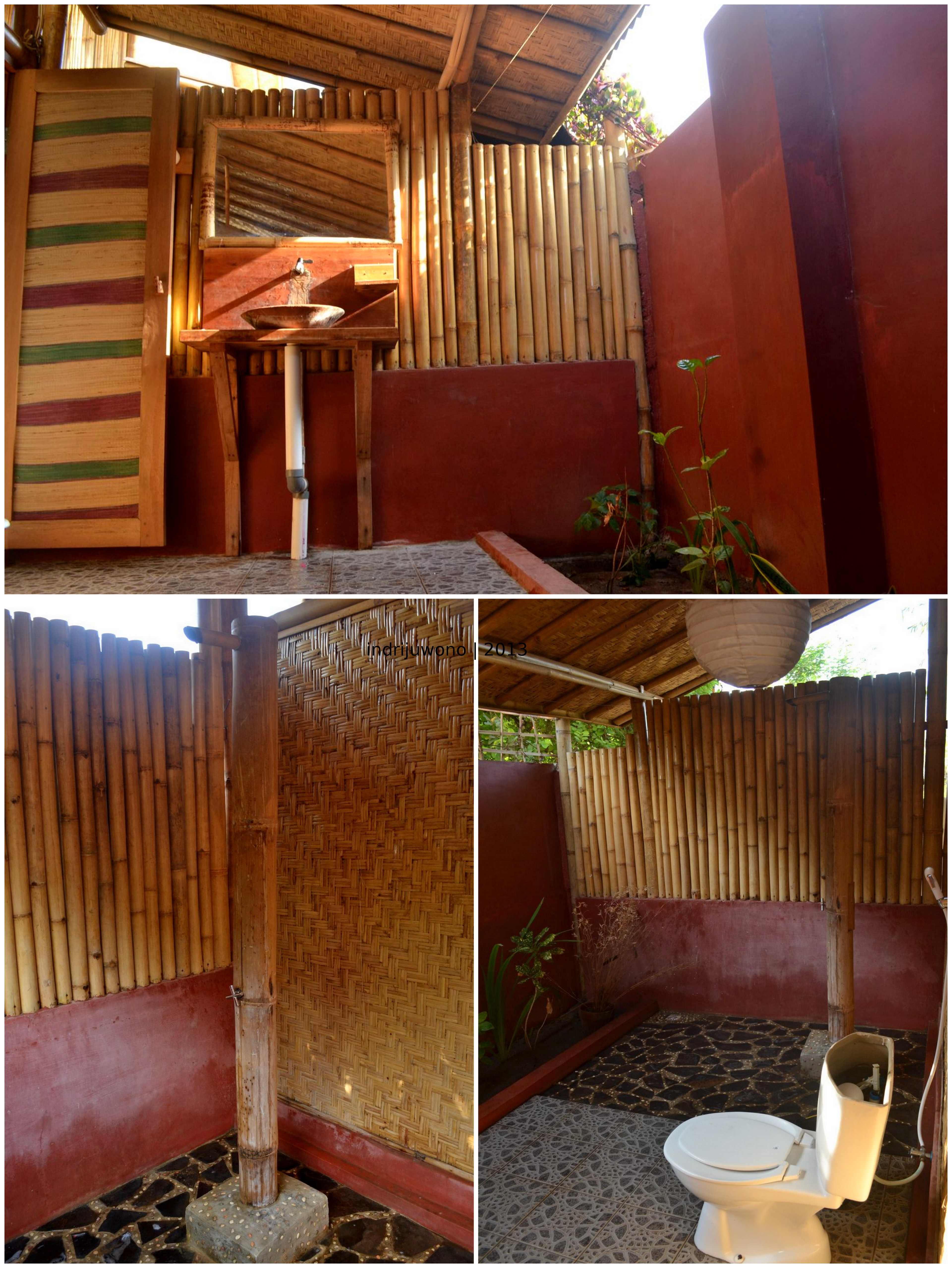 The bathroom was quite spacious enough. I thought five person could enter this area. There is a counter lavatory complete with mirror for dress, one toilet and shower unique form of bamboo shower standing in the middle. The floor was made of gray tiles and stone wall broken brick wall with a permanent half and bamboo sticks. Sunlight and direct air entering through the park.
