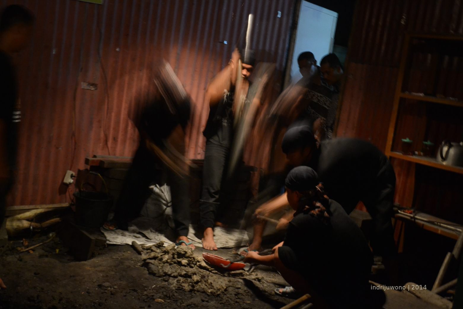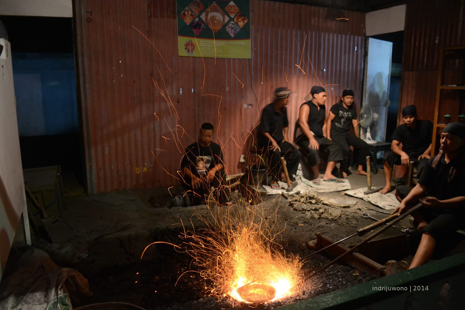 Di sudut terlihat ada keramaian. Wah, rupanya ada tukang pandai besi sedang memamerkan kemampuannya. “Di sini sedang proses membuat gamelan,” kata bapak-bapak yang berdiri di situ. Di dalam ada satu orang yang sedang memanaskan lembaran besi. Tak lama kemudian beberapa orang bergantian memukul menatah besi tersebut sambil dibentuk. Proses ini terjadi berulang-ulang sengan berirama. Tentu untuk menjadikannya satu alat gamelan tidak dibutuhkan proses sesingkat ketika kami melihatnya.