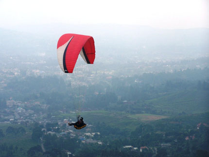 Dari Cianjur perjalanan dilanjutkan ke Bandung hingga Garut. Di sana ada gunung Haruman tempat kita bisa paralayang! Uhuuuwww, asyik banget melompat dari bukit pada saat angin bertiup lalu melayang-layang di udara hingga menjejak tanah lagi. Walaupun masih terbang tandem, namun pengalaman berlari dan mengembangkan payung di udara itu luar biasa menarik dengan sensasi yang tidak tergantikan. Ekstrim banget berada di ketinggian lalu berteriak kencang bebas melayang beberapa menit dan menikmati angin yang menghembus perlahan, lalu manuver turun yang lembut dan menghentak!