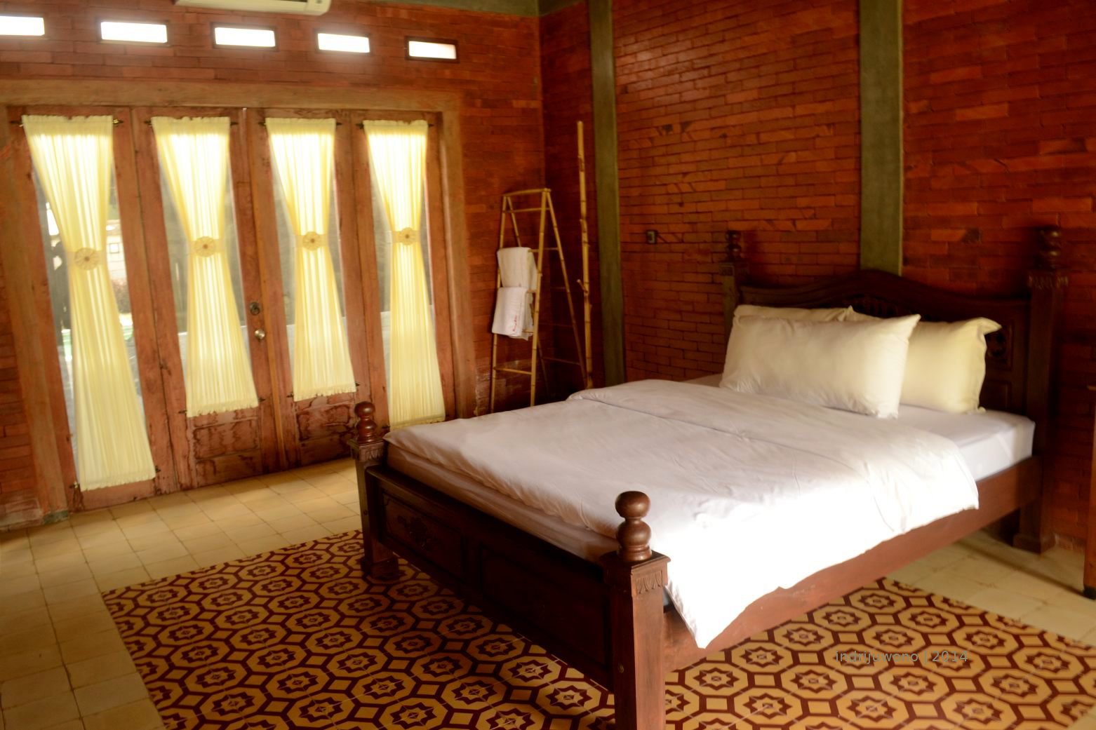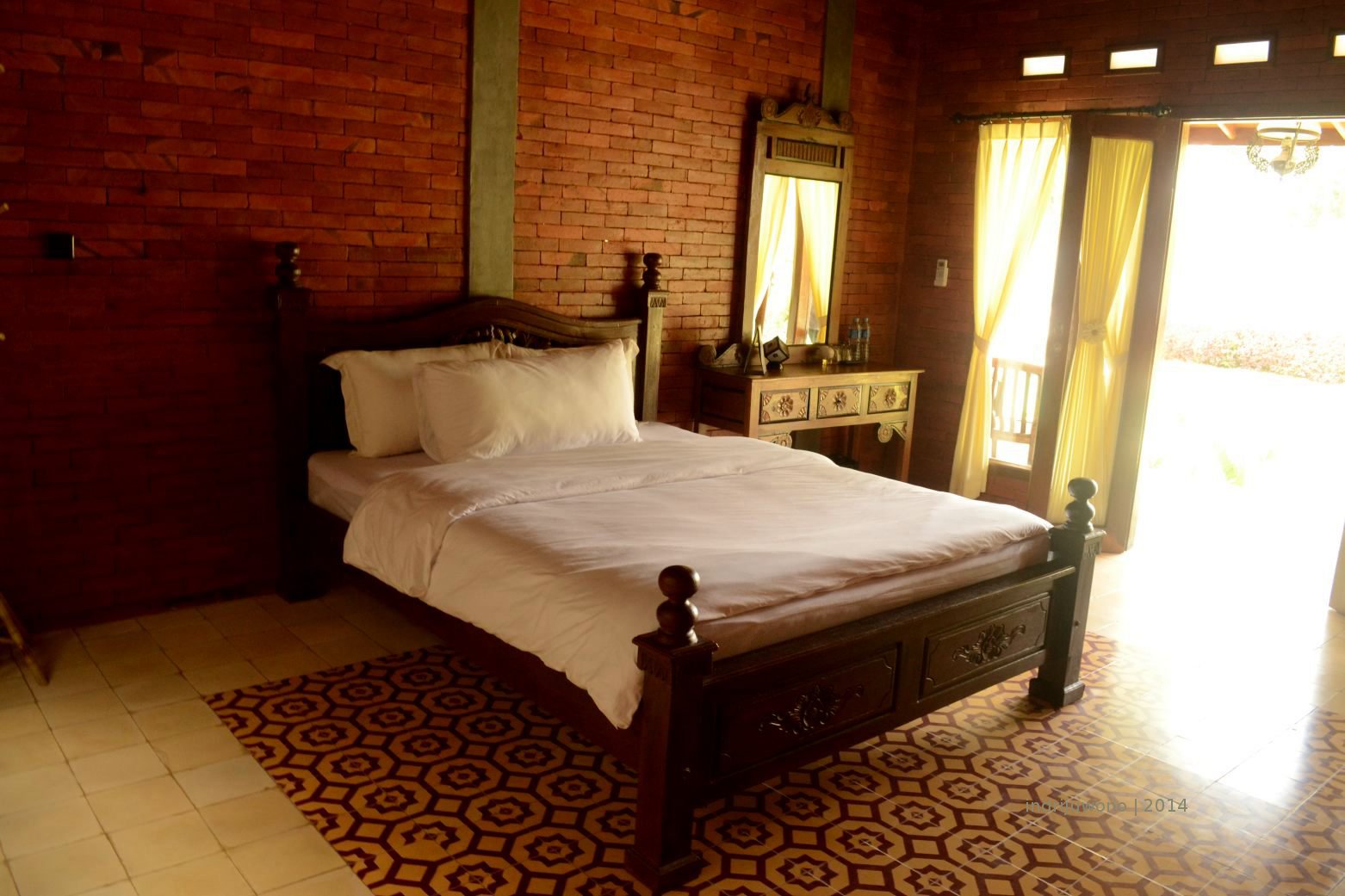 Disambut oleh penjaga villa-nya yang ramah, aku ditawari satu dari tiga kamar yang ada. Langsung aku memilih yang paling jauh dari jalan supaya suasananya tenang. Kamarnya sangat bernuansa etnik dengan satu tempat tidur besar dari kayu jati di tengah, dan satu meja rias. Di sudut ada penggantung mantel dari bambu yang cantik. Yang membuat suasananya hangat, semua dindingnya terbuat dari bata ekspose dengan coating natural. Lantainya dibuat dari tegel cap dengan pola-pola organik yang unik. Aku langsung jatuh cinta dengan kamar yang menyenangkan ini. Apalagi di depannya ada kolam renang yang menggoda, langsung aku mencebur merasakan airnya selama 15 menit. Ahh, di dalam air sebentar bisa melemaskan otot-otot yang seharian beraktivitas.