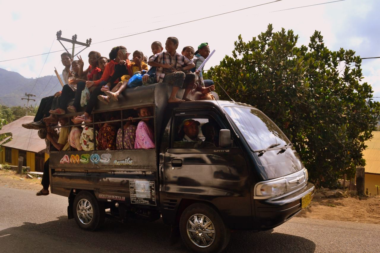 Beberapa orang berkumpul di tepi jalan menunggu kendaraan usai mereka beribadah di gereja. Beberapa anak-anak bermain-main. Ada satu pick-up berisi orang-orang yang hendak pulang ke desanya. Berdesakan, tapi mereka tetap tersenyum. Tak ada sorak usil mengomentari pendatang seperti kami. Aku tidak merasa asing di tengah-tengah mereka.