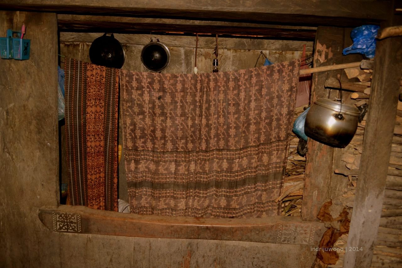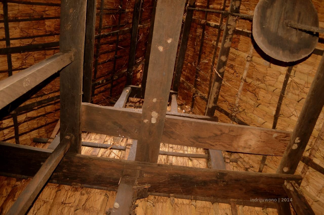 Aku mengamati sekeliling. Ruangan tengah ini tidak terlalu lebar hanya berukuran sekitar 4×4 meter. Penerangan hanya berasal dari celah-celah atap. Di tepian-tepian balok kayunya diletakkan mangkuk-mangkuk tanah liat yang dipergunakan untuk keperluan upacara. Di situ juga digantung tampah dan aneka peralatan memasak lainnya. Tapi meskipun tidak terlalu terang, namun udara di dalam bangunan rumah adat ini tidak lembab. Atap yang tinggi tanpa langit-langit membuat udara di dalam tidak terperangkap di dalam dan mencari jalan keluar lewat celah-celah cahaya.