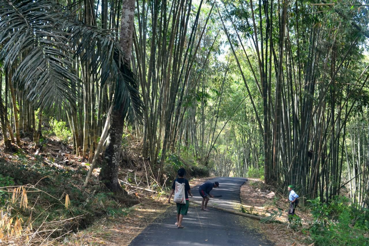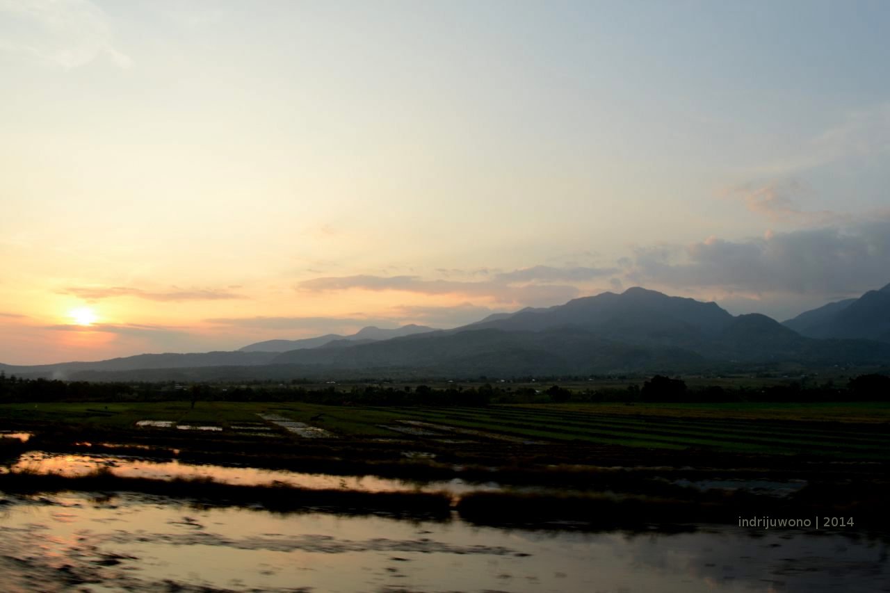 Perjalanan kami menuju arah selatan, terus melalui jalanan naik turun bukit sampai akhirnya kami menemukan desa-desa di tepi hamparan sawah yang begitu indah. Ternyata di balik hutan-hutan dari kota tadi, desa-desa di sini begitu hidup dari hasil-hasil pertanian. Hujan yang sudah berhenti membuat matahari senja menemani perjalanan di jalan berbatu-batu itu. Mas Agus cukup terampil mengemudikan mobilnya di antara jalan yang sangat tidak bisa dibilang bagus ini.